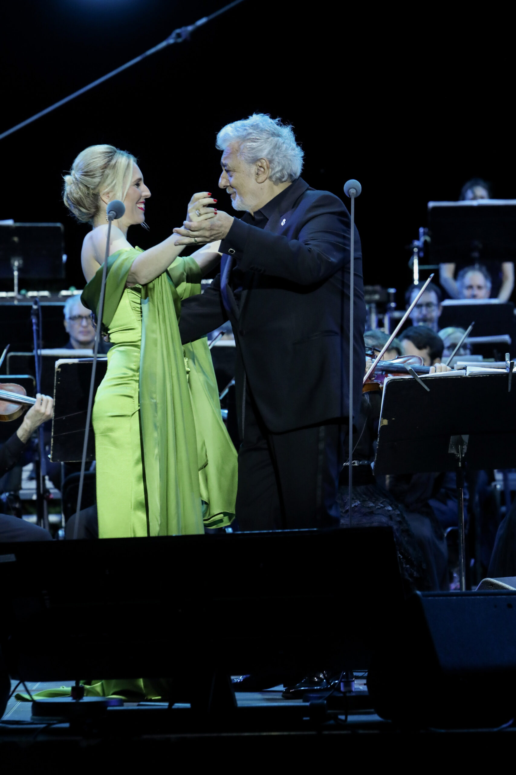 Ο Plácido Domingo ανέβηκε στη σκηνή ευθυτενής και χαμογελαστός και καταχειροκροτήθηκε, ενώ με σειρά της λίγο πιο μετά υποκλίθηκε στο κοινό και η Ελληνίδα σοπράνο Χριστίνα Πουλίτση.