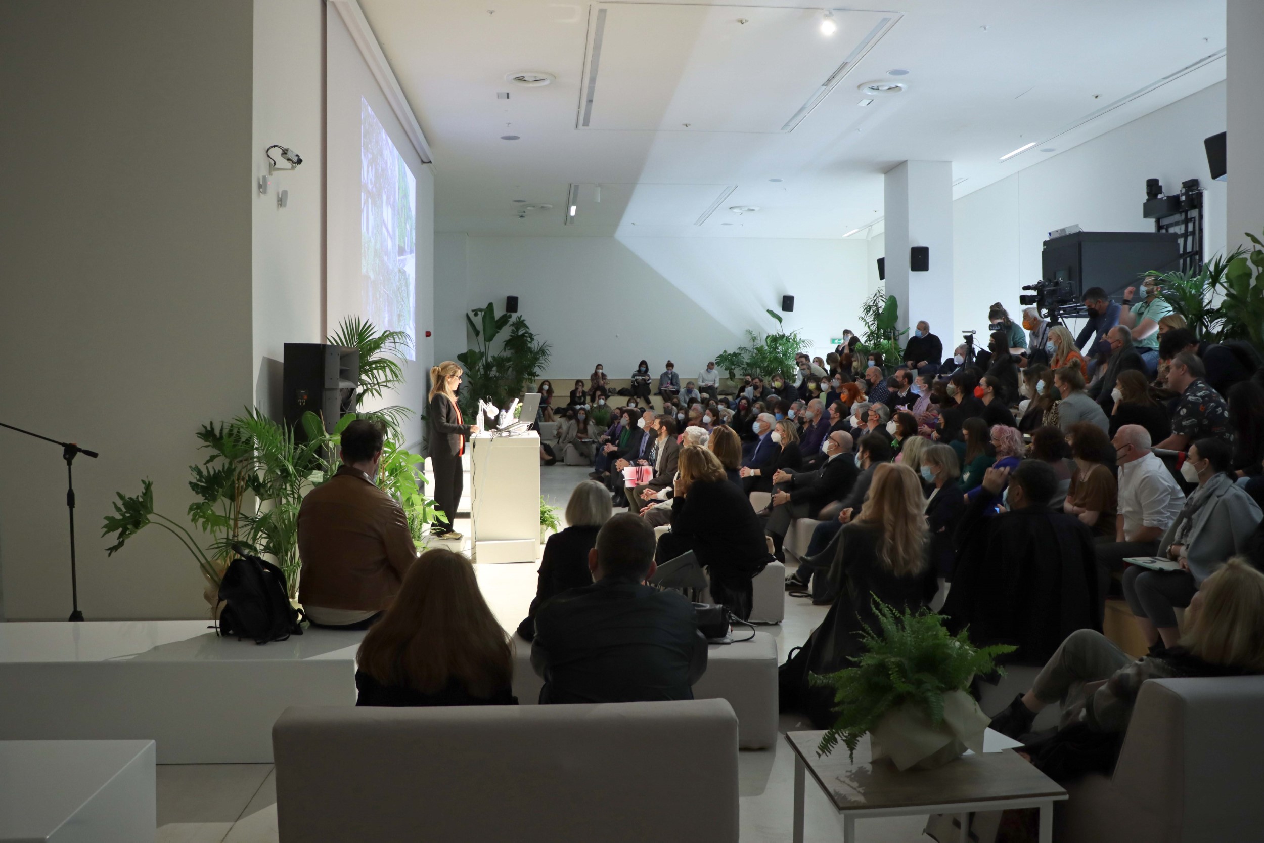 “Στόχος του ΕΜΣΤ είναι να γίνει ο κορυφαίος εθνικός θεσμός για τη σύγχρονη τέχνη και τον οπτικό πολιτισμό στην Ελλάδα, και ένας από τους ηγετικούς θεσμούς της Νότιας Ευρώπης και της Ανατολικής Μεσογείου”, τόνισε η κ. Γρέγου που ανέβηκε στο βήμα μετά τον πρόεδρο του διοικητικού συμβουλίου του φορέα Αγγελή Αντωνόπουλο, τον υφυπουργό Πολιτισμού Νικόλα Γιατρομανωλάκη και τη διοικητική και οικονομική διευθύντρια Αθηνά Ιωάννου.