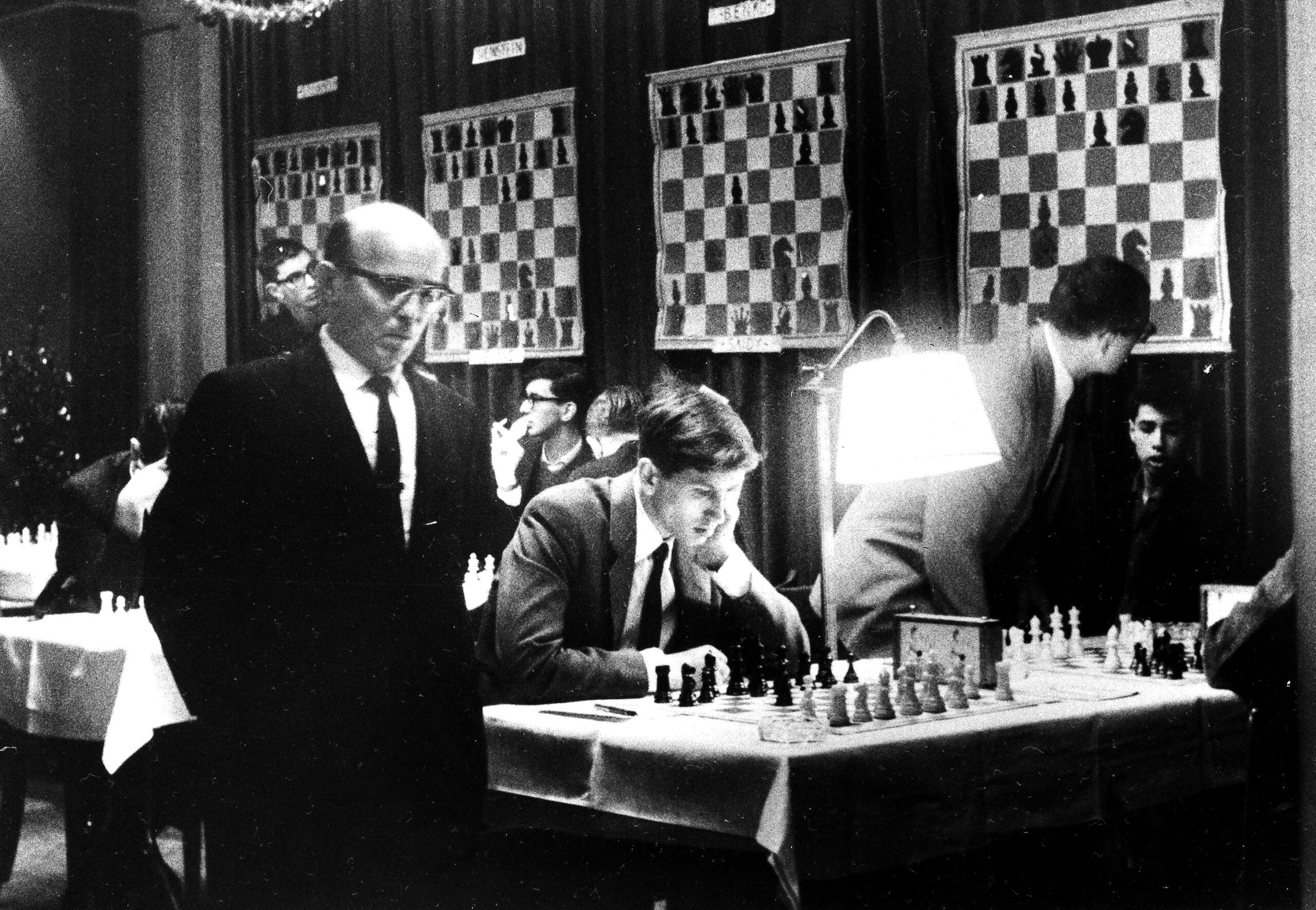 Ο 16χρονος Μπόμπι Φίσερ αντιμετωπίζει τον Σοβιετικό Βασίλι Σμισλόφ (πρώην παγκόσμιο πρωταθλητή) στο Διεθνές Σκακιστικό τουρνουά του Βελιγραδίου. Ο Φίσερ κέρδισε τον αγώνα (29/10/1959). ⓒ 1959 Associated Press