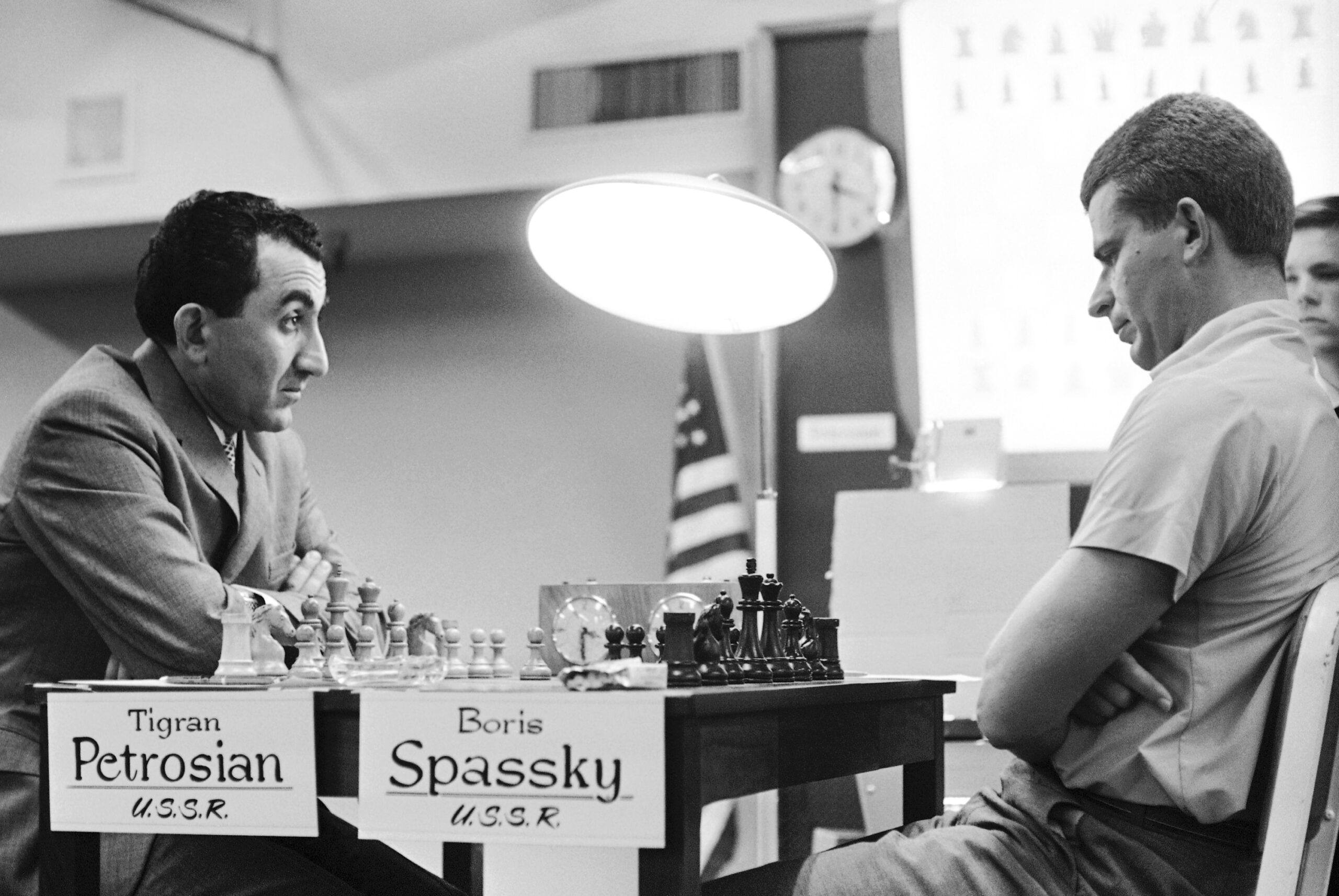 Μπόρις Σπάσκι και Τιγκράν Πετροσιάν, στην έναρξη του τελικού του Παγκόσμιου Πρωταθλήματος του 1969 στη Μόσχα. Ο Σπάσκι κέρδισε 12,5-10,5 και κατέκτησε τον παγκόσμιο τίτλο (14/4/1969). ⓒ 1969 V. Shandrin/TASS Fotokronika/Associated Press
