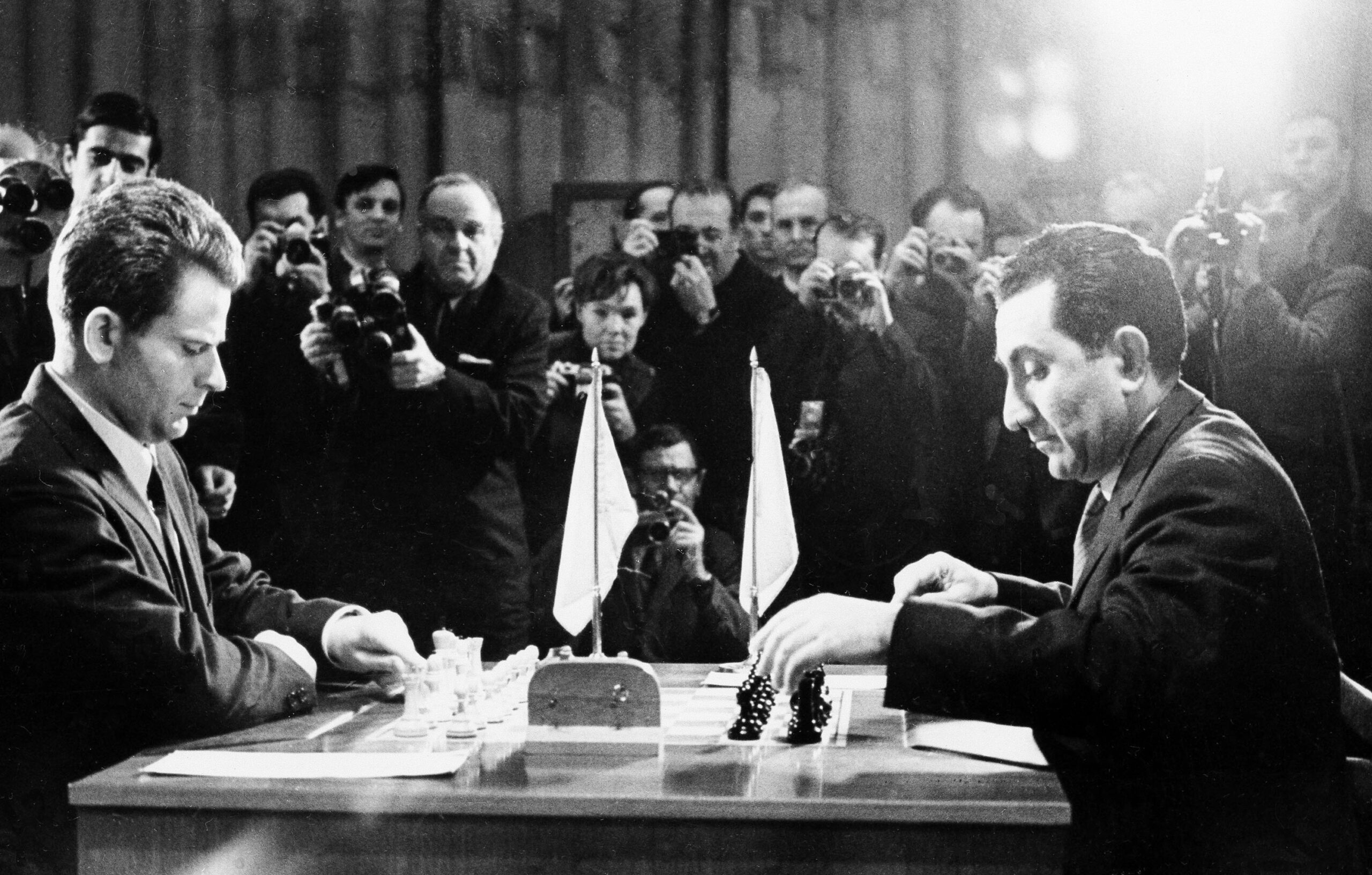 Ο 15χρονος Μπόμπι Φίσερ αντιμετωπίζει τον Σοβιετικό γκρανμαίτρ (και μετέπειτα παγκόσμιο πρωταθλητή) Τιγκράν Πετροσιάν, στην πρώτη του επίσκεψη στη Μόσχα (30/6/1958). ⓒ 1958 Associated Press