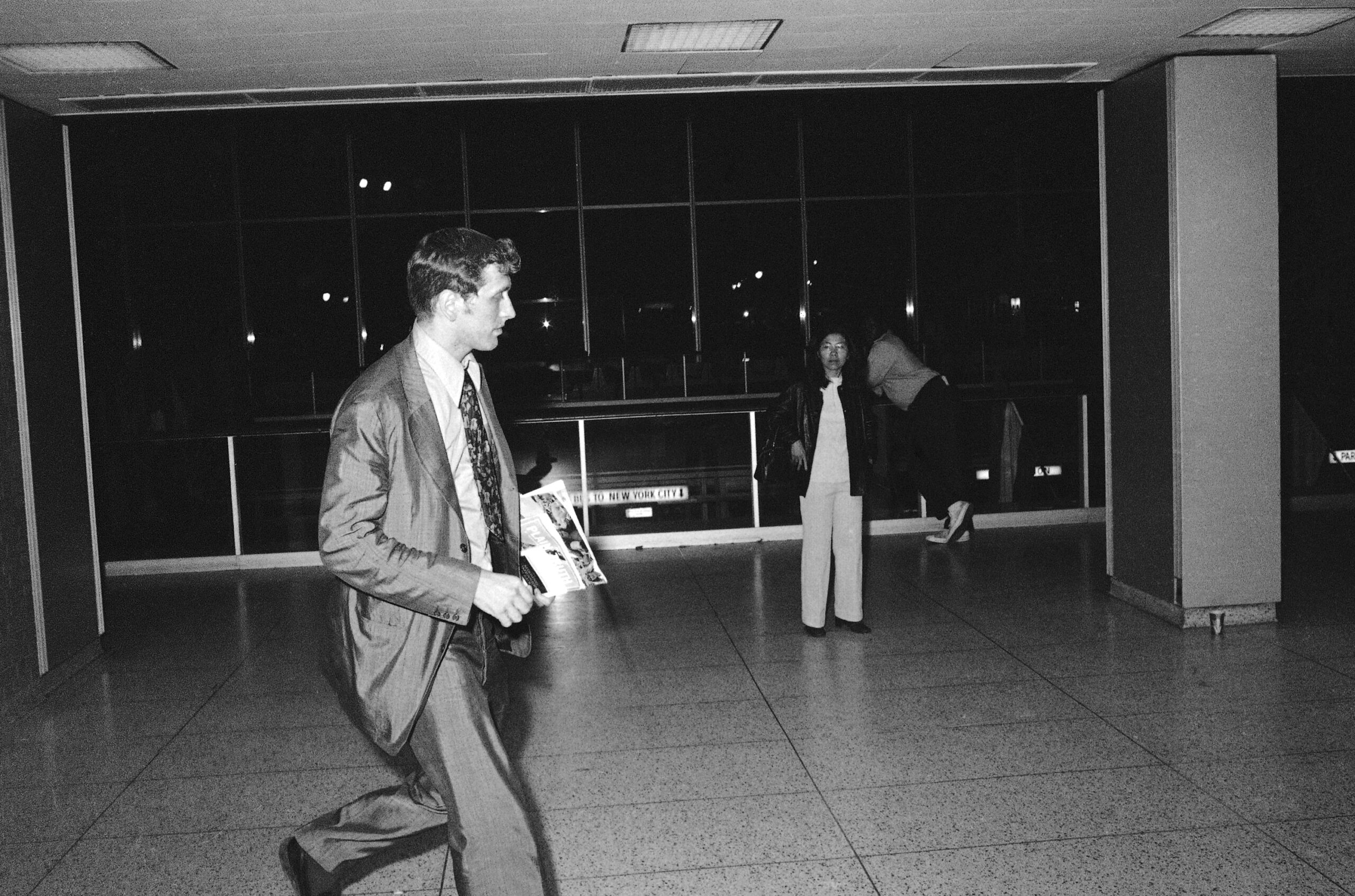 Ο Μπόμπι Φίσερ στο αεροδρόμιο JFK της Νέας Υόρκης, τρέχοντας για να αποφύγει τους δημοσιογράφους. Εκείνη την ημέρα θα πετούσε για το Ρέικιαβικ, αλλά τελικά ανέβαλε το ταξίδι του (29/6/1972). ⓒ 1972 Associated Press
