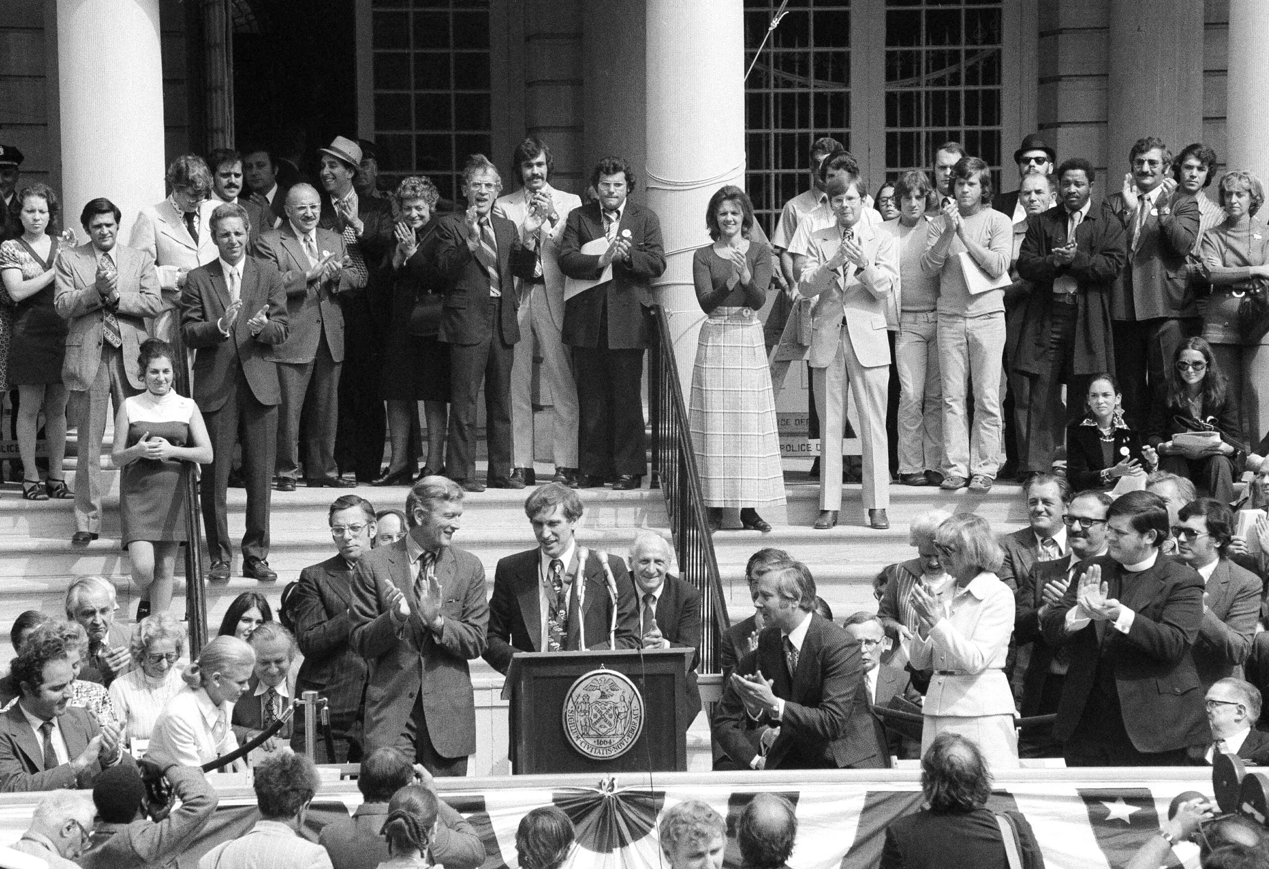 Ο Μπόμπι Φίσερ, έξω από το Δημαρχείο της Νέας Υόρκης, μιλάει στο συγκεντρωμένο πλήθος, κατά την υποδοχή του από τον δήμαρχο, Τζον Λίντσεϊ, στην "Bobby Fischer Day" (22/9/1972). ⓒ 1972 Associated Press