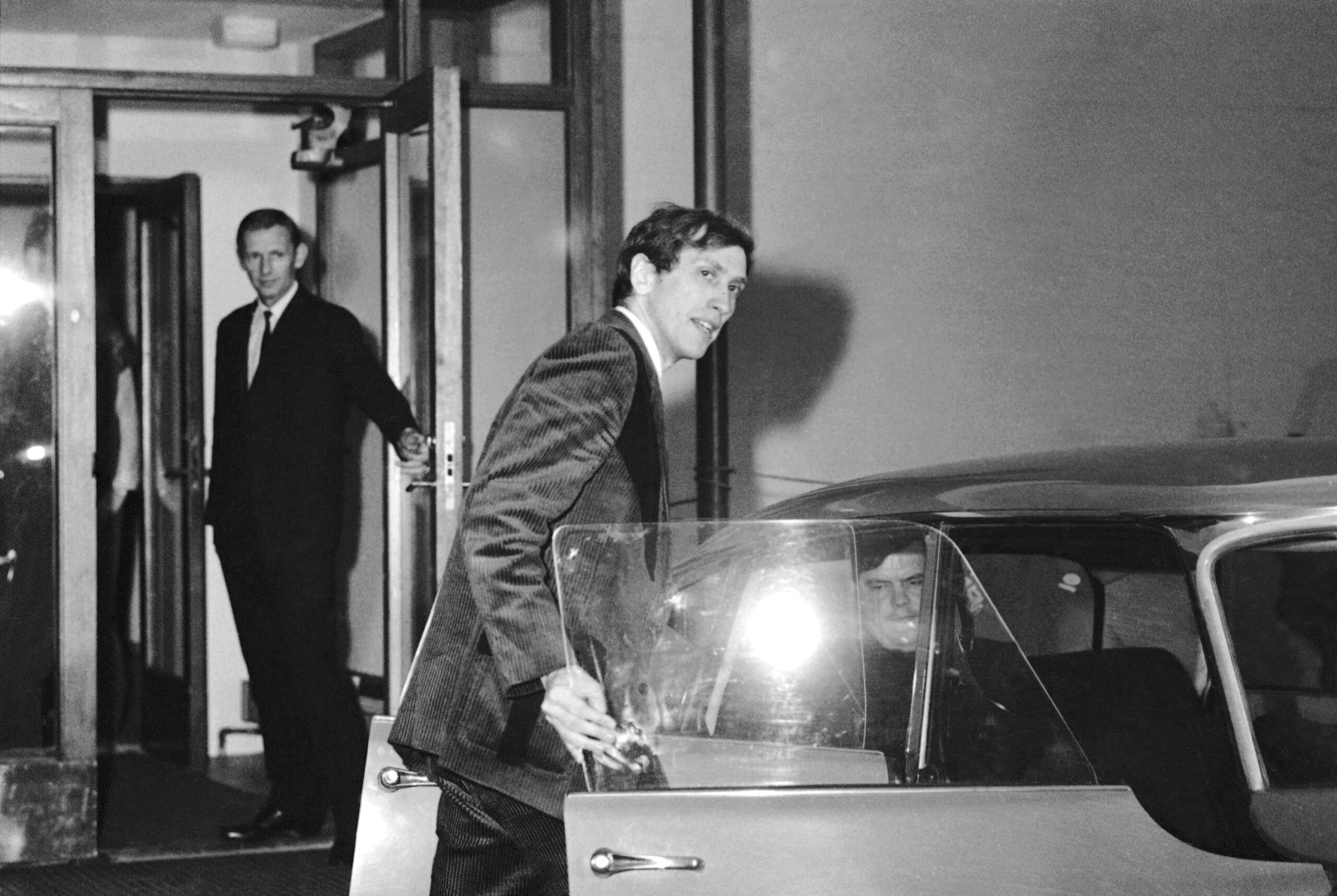Ο Μπόμπι Φίσερ φεύγει από το Laugardalsholl αμέσως μετά την ολοκλήρωση της 20ης παρτίδας, που τον έφερε μόλις μια νίκη μακριά από τον παγκόσμιο τίτλο (28/8/1972). ⓒ 1972 J. Walter Green/Associated Press