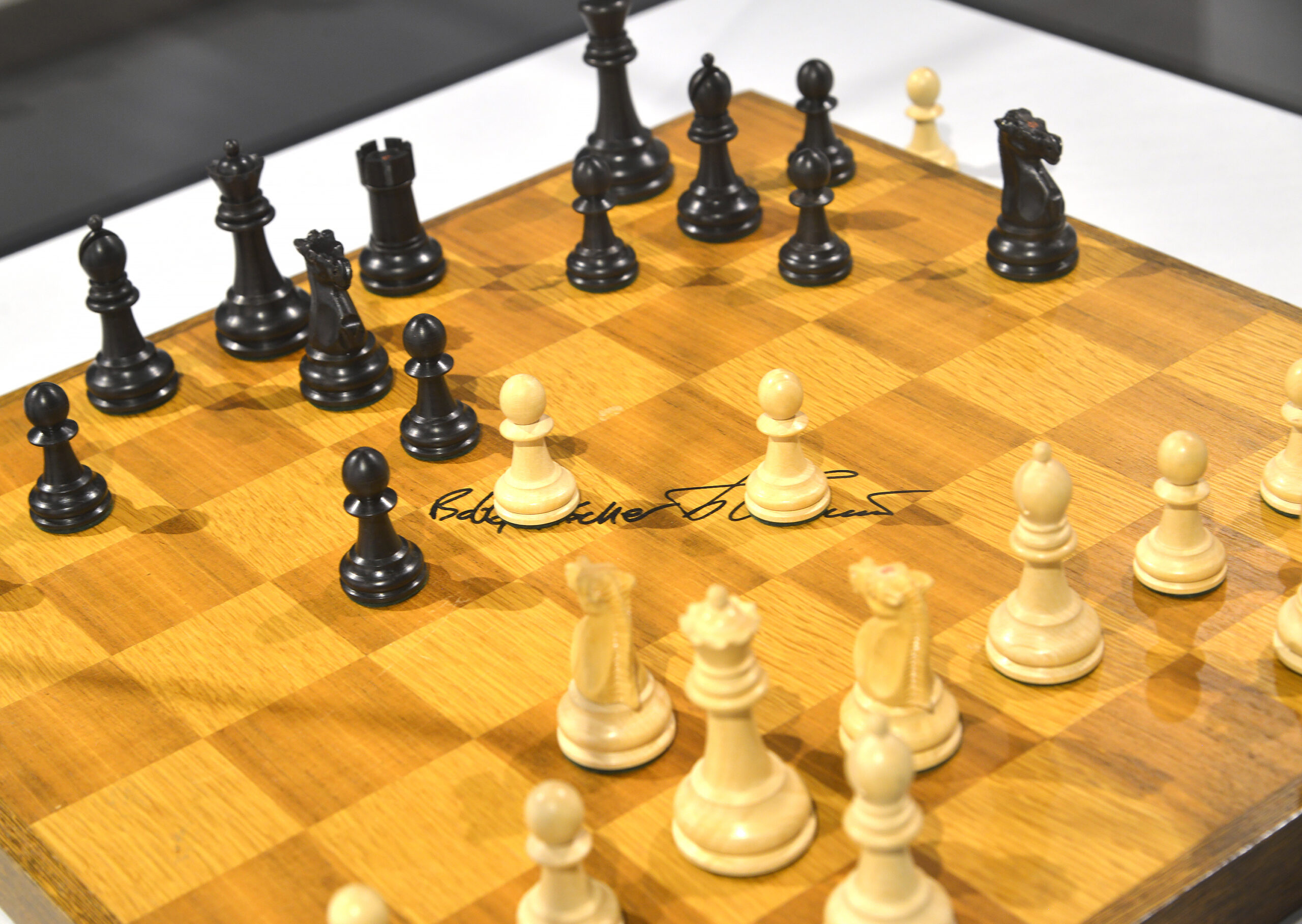 Το σκακιστικό σετ με το οποίο έπαιξαν οι Φίσερ και Σπάσκι στον τελικό του Ρέικιαβικ - μαζί με τις υπογραφές τους στο κέντρο της σκακιέρας - όπως εκτίθεται σήμερα στο World Chess Hall of Fame στο Σαιντ Λούις των ΗΠΑ. ⓒ 2019 Tim Vizer/Associated Press