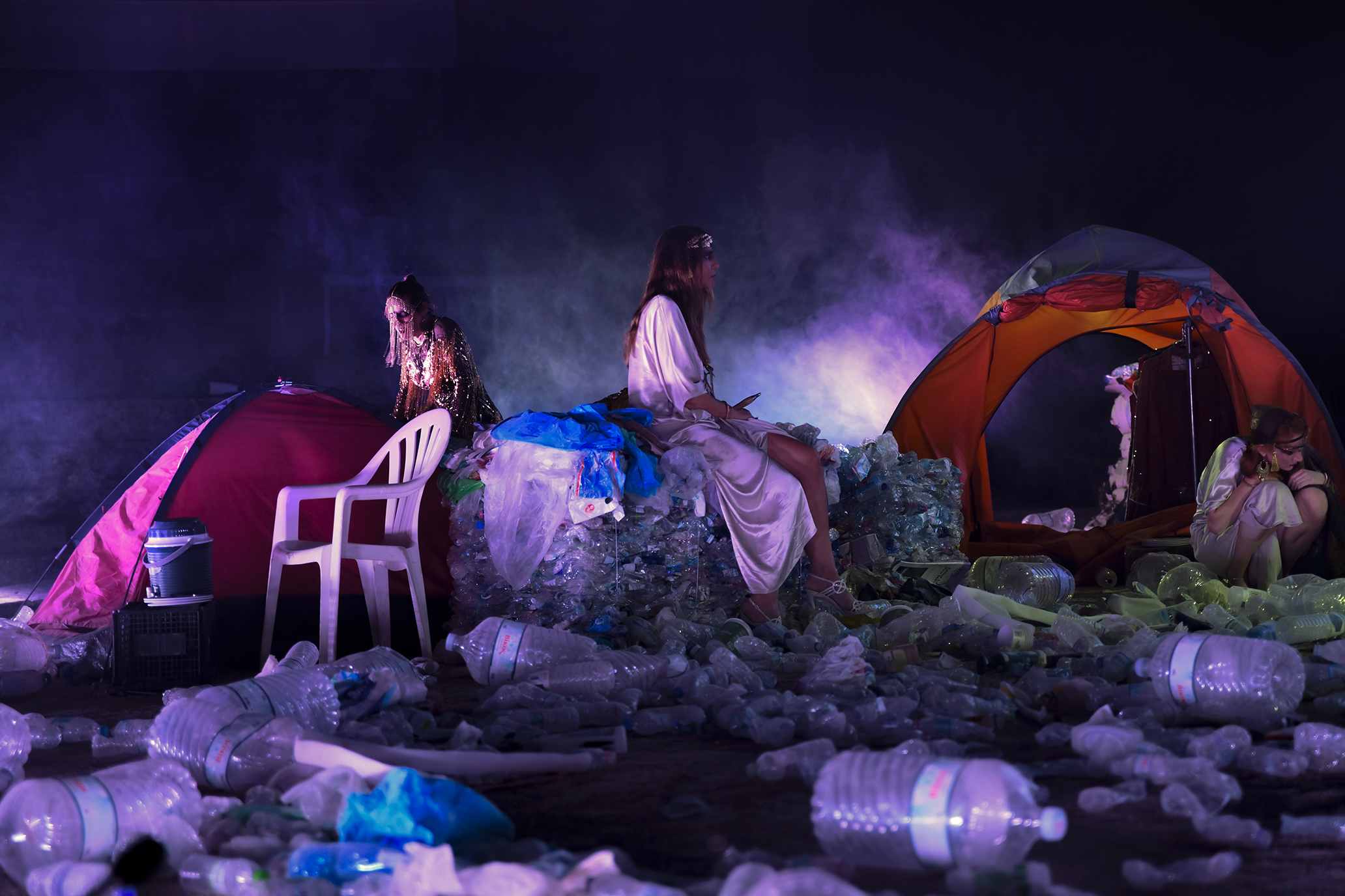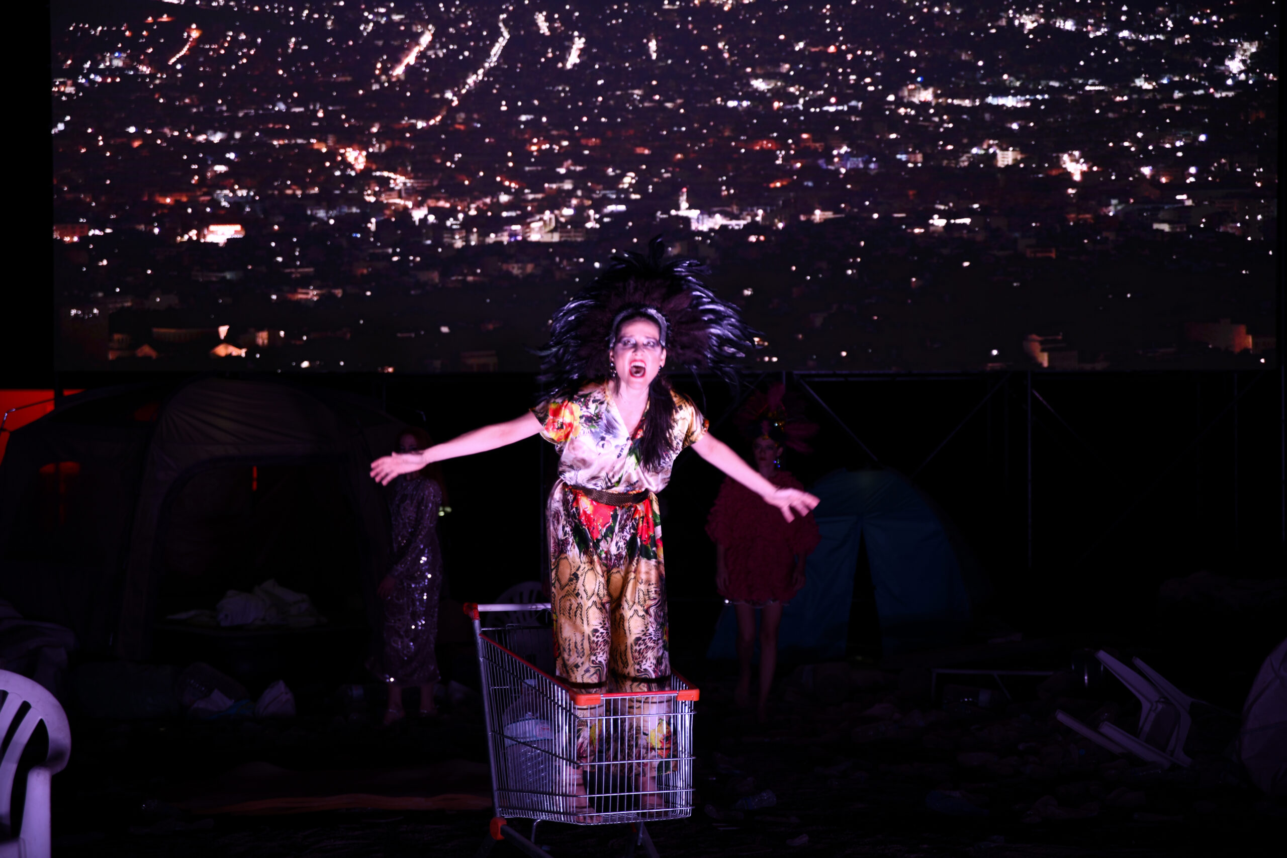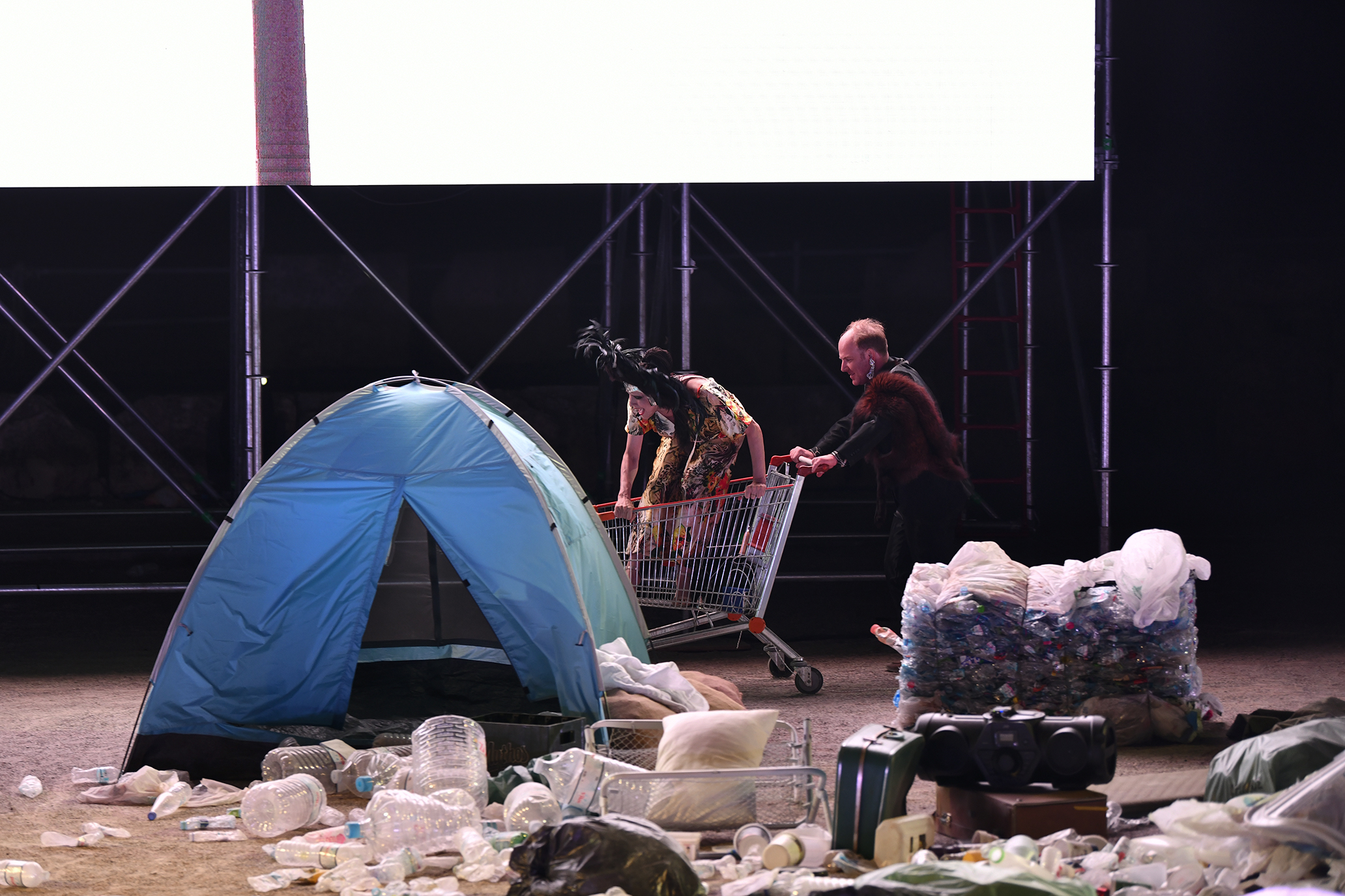 Η παράσταση ξεκινά και στην γιγαντοοθόνη ξεκινούν να προβάλλονται εικόνες από μεγαλουπόλεις. Εικόνες πιξελιασμένες που τρεμοπαίζουν σαν να διανύουμε σαν ανθρωπότητα τις τελευταίες μας ημέρες. Πλατείες, αγορές, συντριβάνια, ένας κόσμος κατεστραμμένος, αποδομημένος, ένας κόσμος προς πώληση, όπως υποδηλώνει και το επιβλητικό FOR SALE που αναγράφεται με έντονα γράμματα στην οθόνη. Ένας κόσμος ανδροκρατούμενος στον οποίο ακόμη και μία λούτρινη Μίνι Μάους έχει παγιδευτεί σε δίχτυα ποδοσφαιρικά.