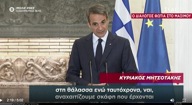 Στην απομαγνητοφώνηση που δόθηκε στη δημοσιότητα, η διατύπωση του πρωθυπουργού μεταφέρεται ως εξής: “Σώζουμε ανθρώπους στη θάλασσα ενώ ταυτόχρονα, ναι, δεν επιτρέπουμε στα σκάφη που έρχονται από την Τουρκία να εισέλθουν στα χωρικά μας ύδατα, όπως είναι δικαίωμά μας βάσει των ευρωπαϊκών κανονισμών, και περιμένουμε από την Ακτοφυλακή της Τουρκίας να έρθει για να παραλάβει τους ανθρώπους αυτούς και να τους επιστρέψει στην Τουρκία”.