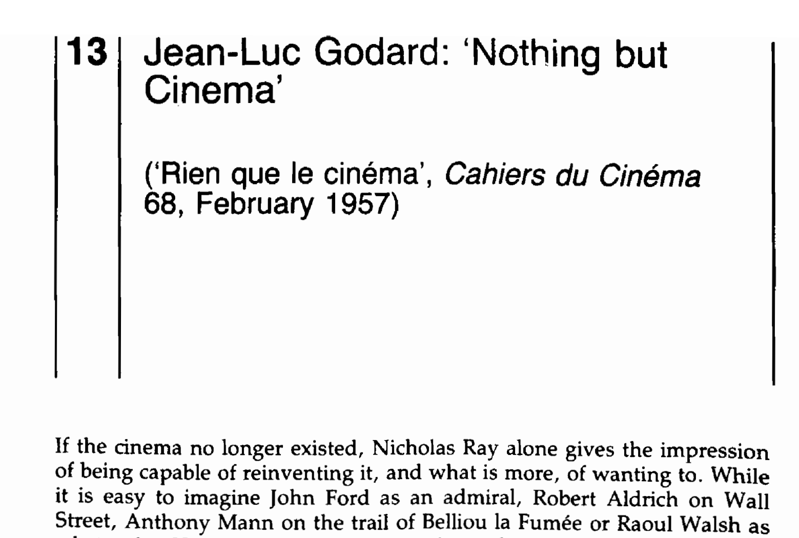 Τα αναφέρουμε όλα αυτά τόσο για να δοθεί το στίγμα της εποχής, όσο και για να υπογραμμιστεί μια συναρπαστική αντίθεση. Είναι γνωστό πως τα Cahiers έπαιξαν τεράστιο ρόλο στην φιλμική αναγνώριση μεγάλων χολιγουντιανών masters , ενώ συγκεκριμένα ο Γκοντάρ έχει γράψει σπουδαία κείμενα πάνω στο έργο σκηνοθετών σαν τον Νίκολας Ρέι, τον Χάουαρντ Χοκς, τον Ντάγκλας Σερκ. Το Χόλιγουντ και η παραδοσιακή του φιλμική αφήγηση ήταν κάτι σαν τοτέμ για εκείνη την ομάδα– κάτι που κάνει ακόμα πιο συναρπαστικό αυτό που ακολούθησε. Δηλαδή, στο πλαίσιο της αναδυόμενης Νουβέλ Βαγκ αλλά ιδιαίτερα μέσα από το έργο του Γκοντάρ, μια συνεχιζόμενη (και σκεπτόμενη) ανατροπή αυτών ακριβώς των κανόνων.
