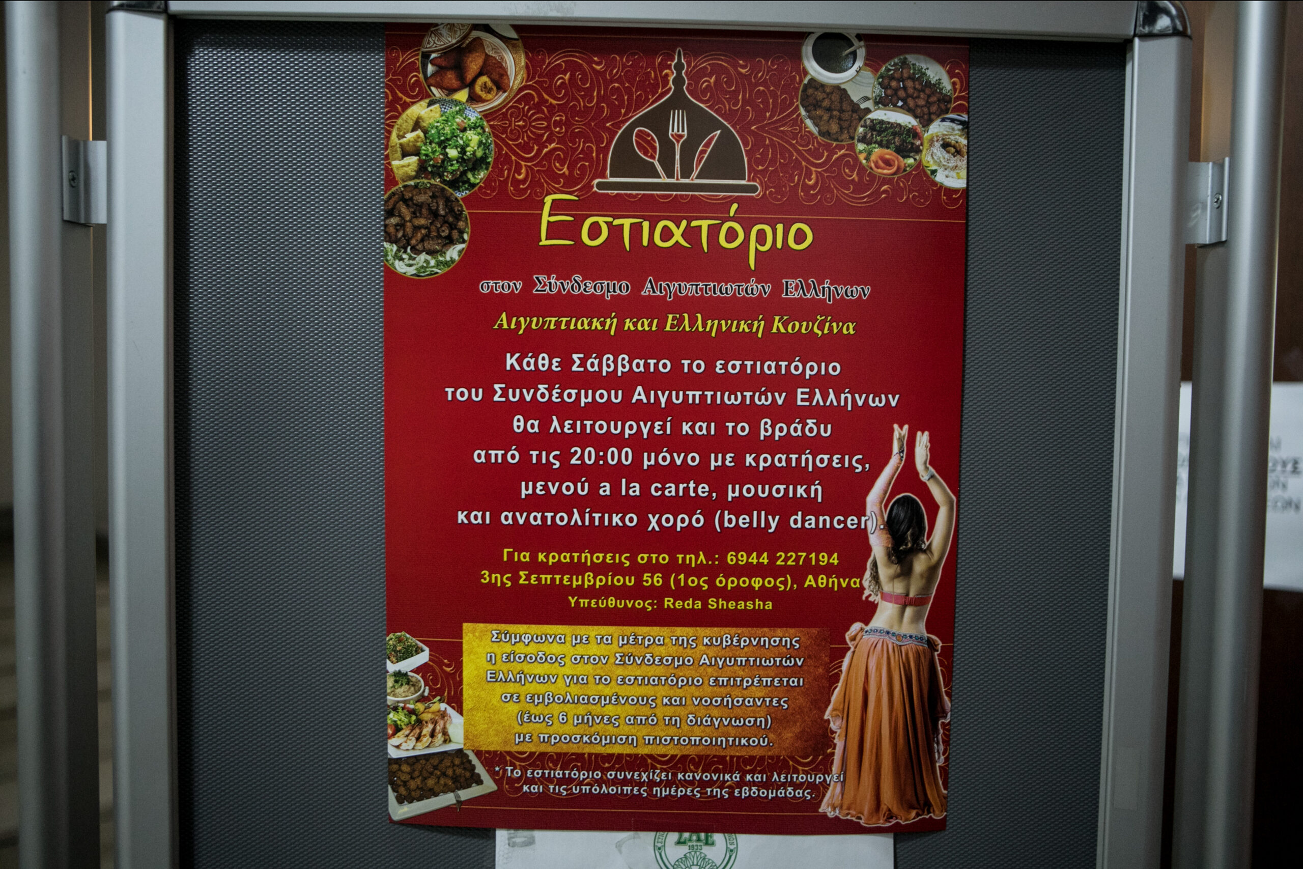 Μία από τις κυριότερες δραστηριότητες του Συνδέσμου Αιγυπτιωτών Ελλήνων είναι η διατήρηση ενός εστιατορίου εντός του χώρου όπου στεγάζεται, το οποίο είναι ανοιχτό για να το επισκεφθεί ο καθένας, είτε ανήκει στον Σύλλογο είτε όχι. Στο πλάι του μικρού σαλονιού όπου βρεθήκαμε, βρίσκεται μία μεγάλη σάλα με δεκάδες καλοστρωμένα τραπέζια, τα οποία είναι έτοιμα να υποδεχτούν όποιον θέλει να πάρει – κυριολεκτικά – μια γεύση από τα αυθεντικά πιάτα της Αιγύπτου.