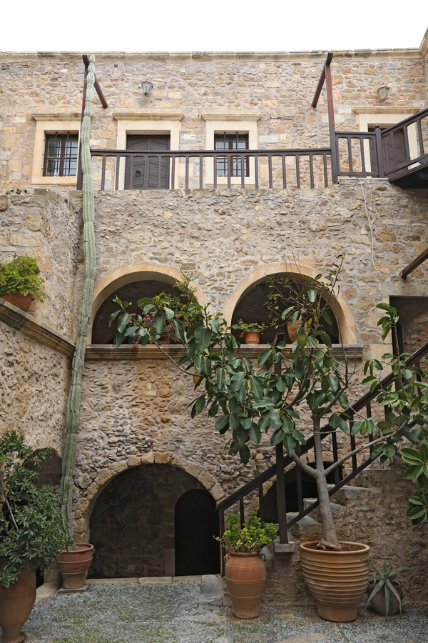 Πατέρας Φιλόθεος: «Όταν ήρθα στο μοναστήρι, οι δραστηριότητες του ήταν καθαρά αγροτικές, λίγα αμπέλια σουλτανιά, ελιές και αιγοπρόβατα. Όμως η ιστορία του ήταν μεγάλη. Τα παλιά χρόνια και μέχρι την κατοχή, τα πράγματα ήταν αλλιώς. Το μοναστήρι είχε πολλά κρασάμπελα και έβγαζε πολύ κρασί και αν πάτε προς το Βάι – όλη αυτή η περιοχή ανήκει στο μοναστήρι – θα δείτε κάτι μικρά σπίτια που στέγαζαν ένα μετόχι. Εκεί υπάρχει ένα πατητήρι που έχει χρονολογία 1709 και γράφει και το όνομα του τότε ηγούμενού που ήταν ο Καλλίνικος. Αυτά τα αμπέλια παρήγαγαν 14 ή και 15 τόνους κρασί που ήταν για τις ανάγκες του μοναστηριού. Τότε υπήρχε μεγάλη φτώχεια στον κόσμο και όλα σχεδόν τα κοντινά χωριά τα συντηρούσε το μοναστήρι. Τάιζε σχεδόν τρακόσια άτομα και κανείς δεν πλήρωνε τίποτα. Ερχόντουσαν καθημερινά και έπαιρναν τροφή ή έτρωγαν το μοναστήρι. Είχε όλα τα καλά, σίγουρα περισσότερα από 15.000 αιγοπρόβατα και άρα υπήρχε αρκετό κρέας αλλά και ένα μεγάλο περιβόλι σε κοντινή περιοχή όπου υπήρχε νερό.