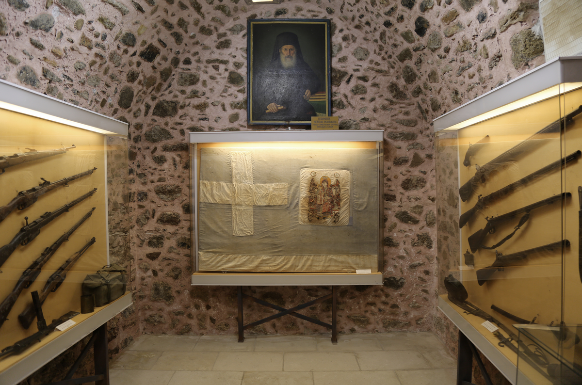 Πατέρας Φιλόθεος: «Η κατάσταση όταν ήρθα στο μοναστήρι όταν ήρθα ήταν χάλια, οι Γερμανοί το είχαν ρημάξει. Όταν μετά το 1942 εγκαταστάθηκε στην περιοχή ένας ασύρματος και τρεις ασυρματιστές για να παρακολουθούν τα συμμαχικά στρατεύματα, ήρθαν σε επικοινωνία με τους βοσκούς του μοναστηριού οι οποίοι τους εγκατέστησαν σε κάτι σπηλιές προς την θάλασσα. Ο Δεσπότης Γεννάδιος ήταν τότε εδώ δόκιμος και τον έστειλαν να τους πηγαίνω φαγητό. Όμως οι Γερμανοί με ράδιογωνιόμετρο τους εντόπισαν και άρχισαν να κάνουν εφόδους και όταν σιγουρεύτηκαν ότι υπάρχει ασύρματος – έπεσαν βέβαια και προδοσίες δυστυχώς από δικούς μας – τους συνέλαβαν. Τους φυλάκισαν και αργότερα τους εκτέλεσαν, άφησαν όμως τον Γεννάδιο ελεύθερο διότι ήταν μικρός.
