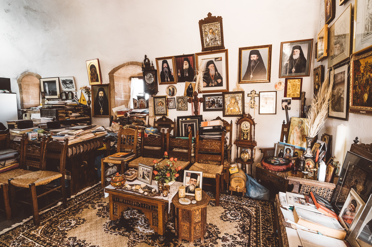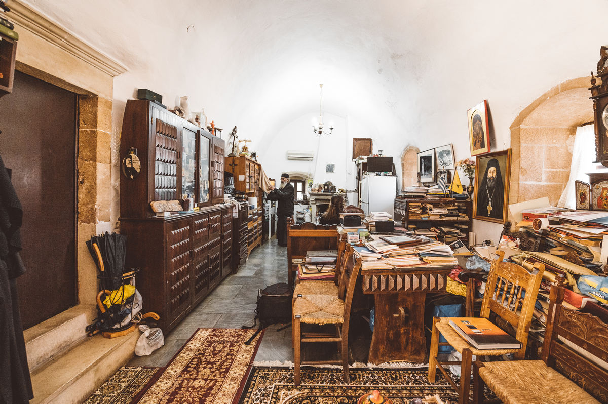 Δεν θέλει να μιλά πια δημόσια ο Πατέρας Φιλόθεος, μα μας υποδέχθηκε στο κελί του με τον Σητειακό φωτογράφο Γιάννη Συκιανάκης με περισσή χαρά. Μας έφτιαξε καφέ και μας φίλεψε μελομακάρονα και κουλουράκια νηστίσιμα. Χώρος κατανυκτικός και ιερός, το κελί που έχει περάσει όλη του τη ζωή. Βιβλία, εικόνες, φωτογραφίες, ατμόσφαιρα επιβλητική, μα φιλική και οικία, σαν να μπαίνεις σε εκκλησιά αγνή, χωρίς κοσμικότητες.