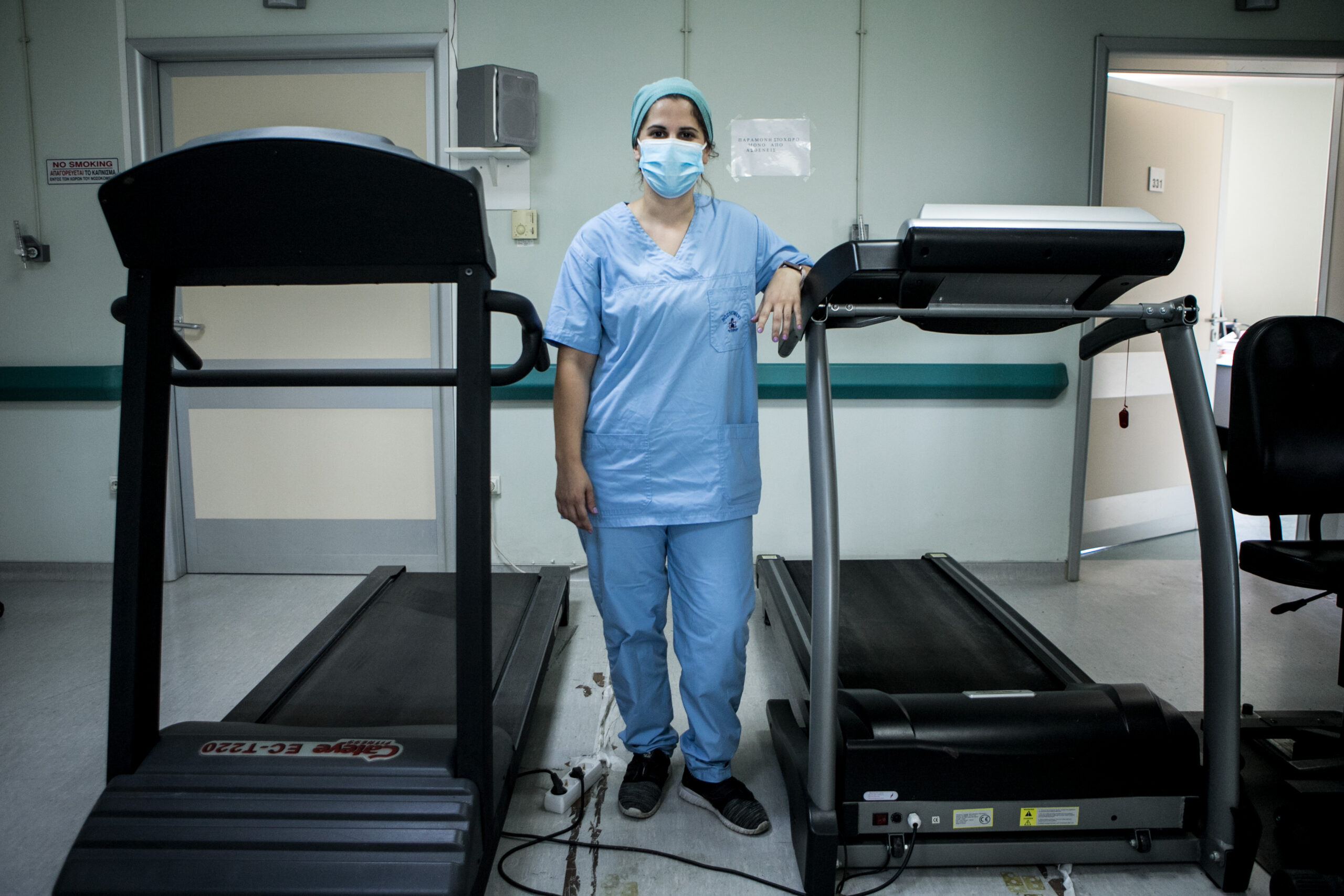 Με τη βοήθεια των φυσικοθεραπευτριών, Ελένης Ρεκλίτη και Τατιάνας Αδαμάκη, ο 65χρονος για δύο φορές την εβδομάδα, κάθε Τρίτη και Πέμπτη προσπαθεί να επαναφέρει τον οργανισμό του στα επίπεδα που βρισκόταν πριν νοσήσει. «Υπάρχουν ασθενείς που δεν μπορούσαν να ανέβουν καν στον διάδρομο γιατί λαχάνιαζαν στο πρώτο βήμα. Στόχος εδώ δεν είναι να τρέξει κάποιος στον διάδρομο. Διδάσκουμε πώς να αναπνέει όταν λαχανιάζει για να μην αγχώνεται όταν του συμβαίνει στην καθημερινότητα. Να περπατήσει σε μια κλίση πάνω στον διάδρομο γιατί είναι κάτι που θα συναντήσει έξω στον δρόμο. Πώς να σηκώσει ένα βάρος. Τα βασικά πράγματα που αντιμετωπίζει καθημερινά» εξηγεί η φυσικοθεραπεύτρια Ελένη Ρεκλίτη.