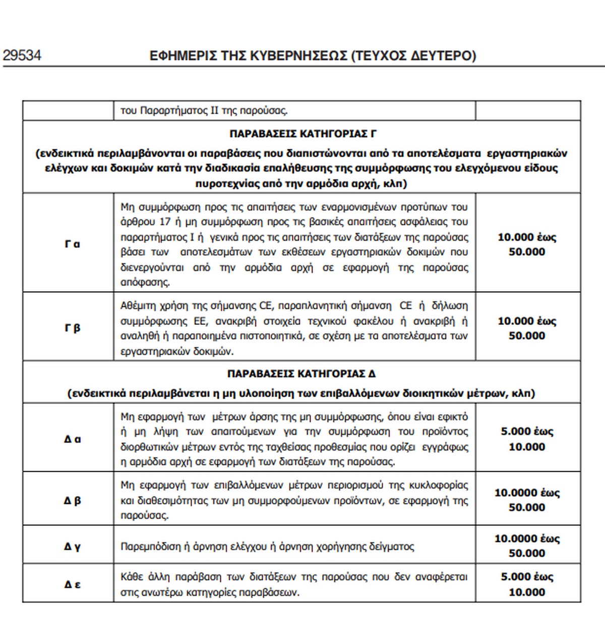 Διατηρείται και το άρθρο 42 (Διοικητικές Κυρώσεις -άρθρο 45 της Οδηγίας. 1. Επιβολή χρηματικών προστίμων και κατηγοριοποίηση των παραβάσεων). Είναι κοινή υπουργική απόφαση του 2015 και αναφέρει τα χρηματικά πρόστιμα, σε κατασκευαστές που δεν τηρούν συγκεκριμένες προδιαγραφές.