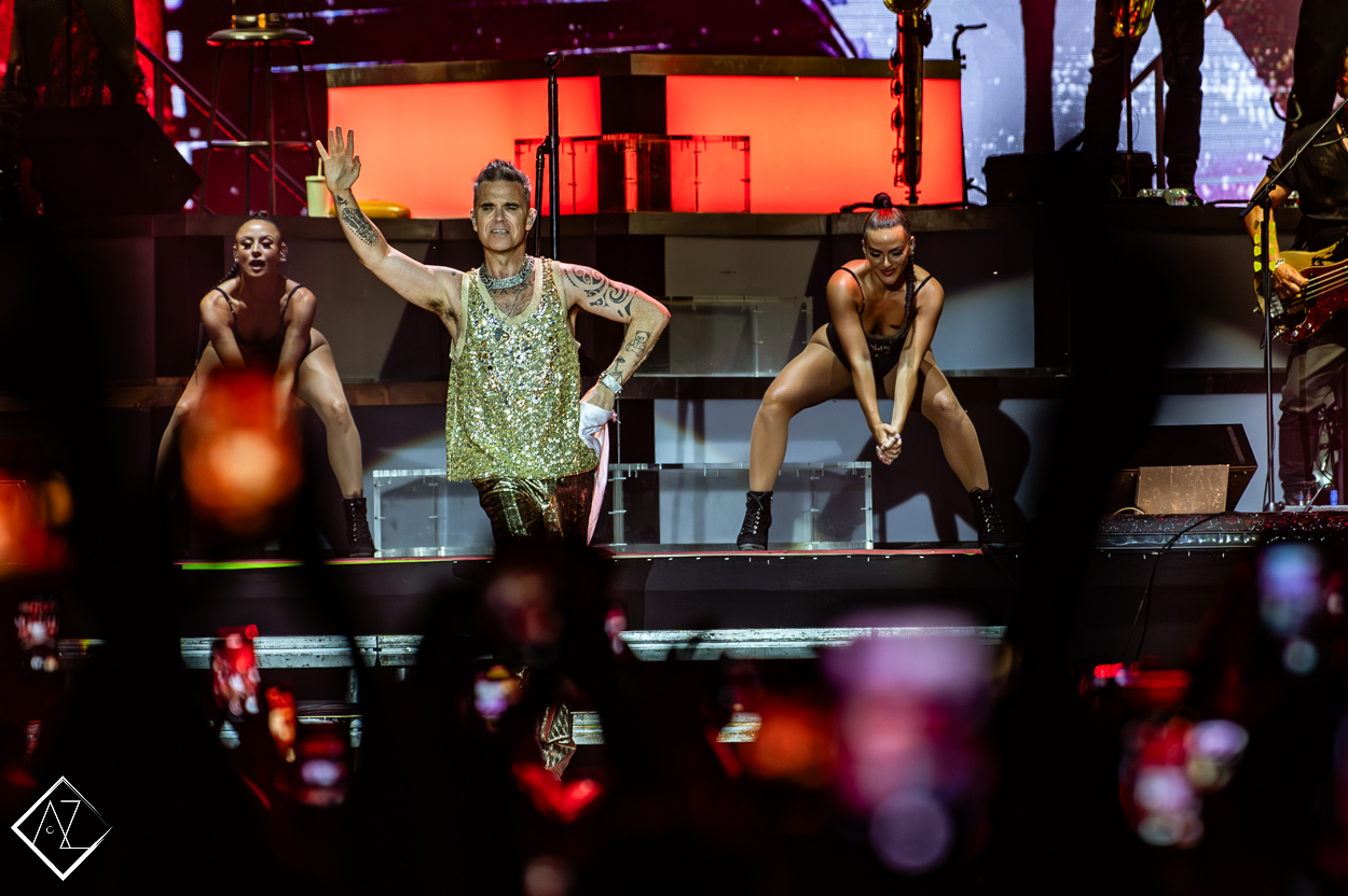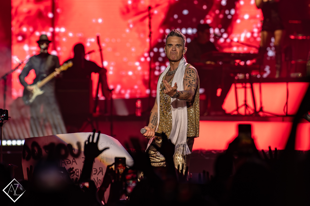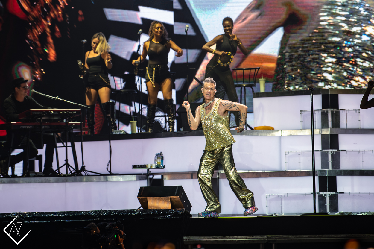 Όλα ξεκινούν με το “Hey Wow Yeah Yeah” γιατί δεν θα ήταν συναυλία του Robbie αυτή αν δεν μας ζητούσε, σαν μικρό παιδί, να τον χειροκροτήσουμε προκαταβολικά. Με ολόχρυση μπλούζα και ολόχρυσο παντελόνι, ένα βαρύτιμο κόσμημα στο λαιμό, μαλλί μοϊκάνα και λίγο πιο αδύνατος από την προηγούμενη φορά που τον είδαμε στη σκηνή του Rockwave ο Robbie ξεκίνησε ένα σόου υπερθέαμα. Visuals, ακτίνες λέιζερ, ορχήστρα, χορεύτριες και τραγουδίστριες τον πλαισίωσαν, συνθέτοντας ουσιαστικά μια μουσικοθεατρική παράσταση με τον ίδιο σε ρόλο Κομπέρ.