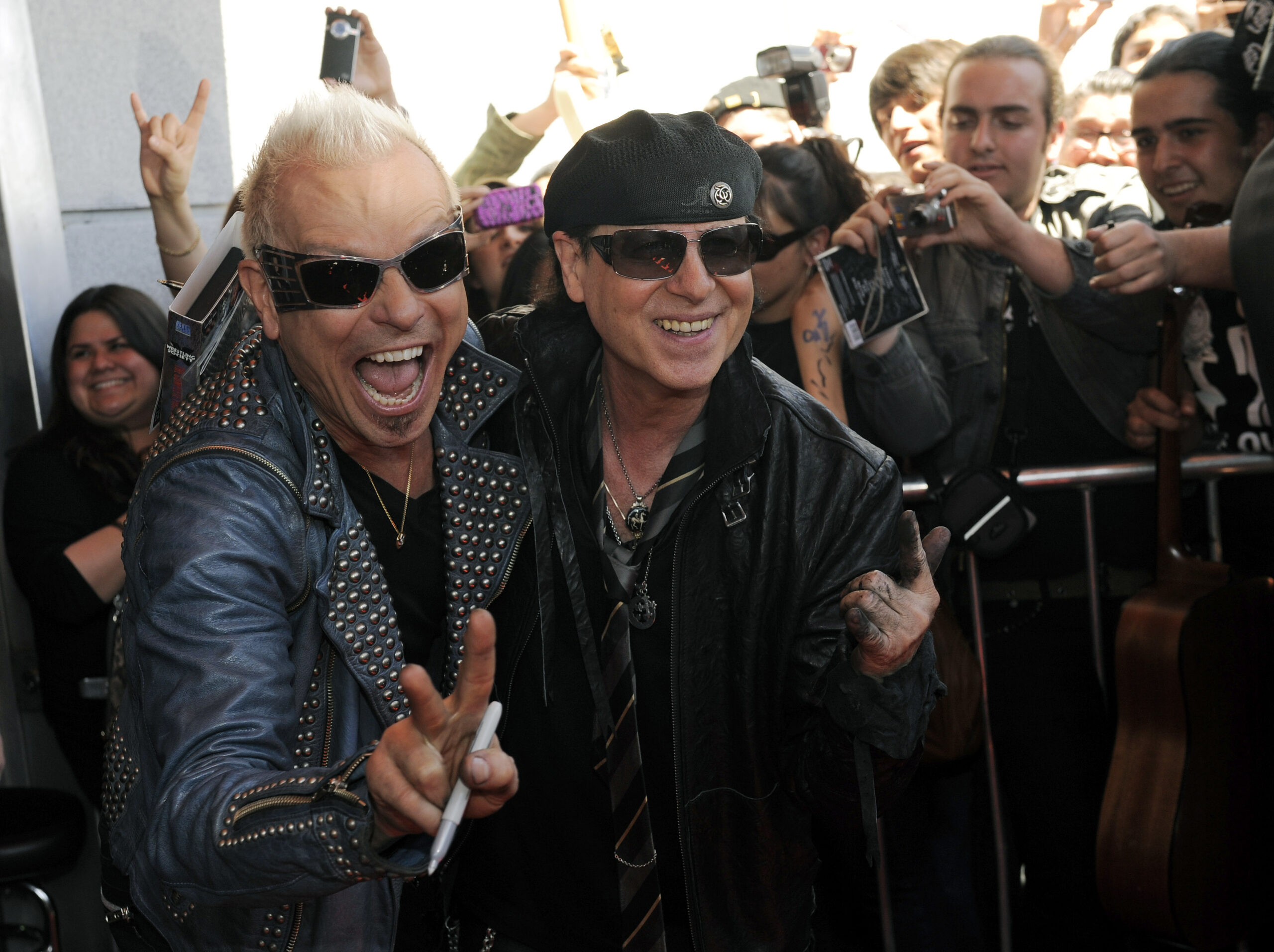 Rudolf Schenker και Klaus Meine ποζάρουν μαζί μετά την επίσημη ένταξη των Scorpions στο Hollywood Rockwalk στο Λος Άντζελες τον Απρίλιο του 2010. Chris Pizzello/AP Photo