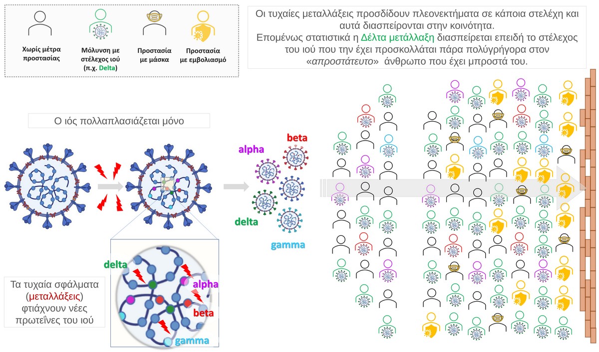 Τα λάθη δίνουν και την ποικιλομορφία των ιών, δηλαδή αυτούς που προσκολλούνται σε ζώα, σε ανθρώπους, που μεταδίδονται πιο γρήγορα κλπ. Δηλαδή τις μεταλλάξεις. Η όποια μετάλλαξη προκύπτει από σφάλμα κατά τον πολλαπλασιασμό του ιού. Η ‘Δέλτα’ έχει την ικανότητα να προσκολληθεί στον άνθρωπο, σε χρόνο μηδέν -γιατί αυτή είναι η δυνατότητα που απέκτησε από τα σφάλματα κατά τον πολλαπλασιασμό. Αν η μετάλλαξη είχε μπροστά της ψάρια, ενδεχομένως να μη μεταδιδόταν και να μην προσκολλούνταν. Έχει ζωτική σημασία αν είμαστε εμβολιασμένοι ή ανεμβολίαστοι”.