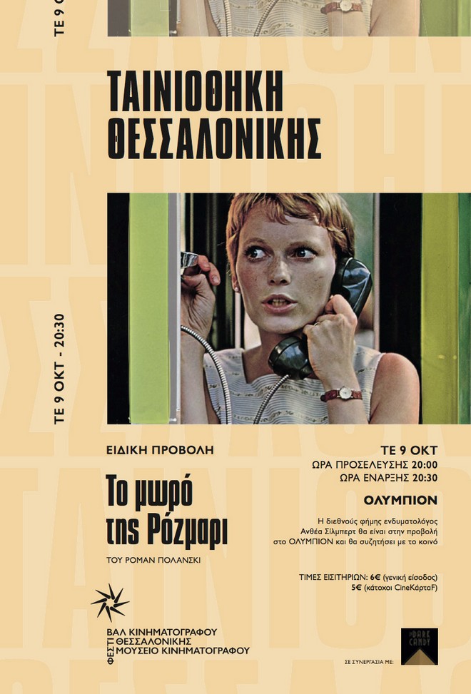 Η επετειακή προβολή της ταινίας “Το μωρό της Ρόζμαρι” θα γίνει την ερχόμενη Τετάρτη 9 Οκτωβρίου στις 20.00 στον κινηματογράφο “Ολύμπιον” στη Θεσσαλονίκη. (πλατεία Αριστοτέλους 10, τηλ.: +30 2310 378400. Τιμή εισιτηρίου: 6 ευρώ κσι 5 ευρώ για κατόχους CineΚάρτας)