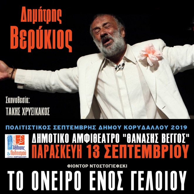 «Εξακολουθώ με την ίδια ανυπομονησία όπως και στο ξεκίνημα, να θέλω να ανεβώ στη σκηνή και να γίνω ο «Γελοίος» του έργου, αφήστε πως κάποιες φορές στενοχωριέμαι, φτάνοντας προς το τέλος της παράστασης» δηλώνει στο News 24/7 ο Δημήτρης Βερύκιος, με αφορμή την παράσταση «Το όνειρο ενός γελοίου», του αριστουργήματος του Φιοντόρ Ντοστογιέφσκι, που παρουσιάζει την Παρασκευή 13 Σεπτεμβρίου, στις 20.30΄, στο ανοιχτό δημοτικό αμφιθέατρο «Θανάσης Βέγγος» του δήμου Κορυδαλλού. Η παράσταση συνεχίζεται για έκτη χρονιά και η σκηνοθεσία είναι του Τάκη Χρυσικάκου.