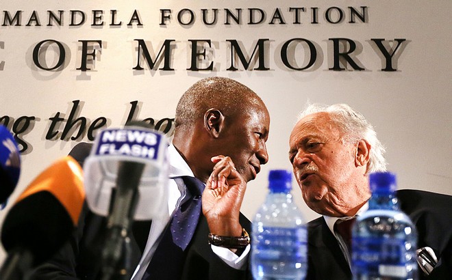 South Africa's deputy chief justice Dikgang Moseneke, left, chats with Advocate George Bizos, right, during their media briefing after a will was read in its entirety to members of Mandelas family at the Nelson Mandela Foundation in Johannesburg, South Africa, Feb. 3, 2014. The Nelson Mandela Foundation Nelson Mandela's estate is worth roughly $4.1 million, excluding royalties and other amounts, and beneficiaries of his will include his family, members of his staff, schools that he attended and the African National Congress, the movement that fought white rule and now governs South Africa, the will's executors said Monday. (AP Photo/STR) AP