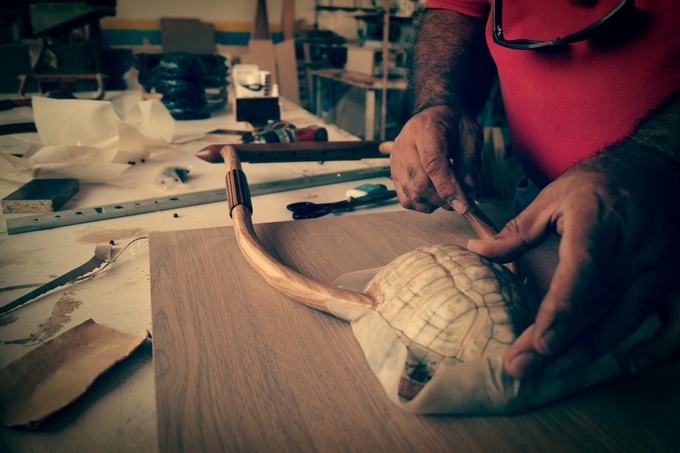 Ωστόσο, αυτό δεν ενδείκνυται για ευρεία παραγωγή. Έτσι κάνουμε καλούπια βασιζόμενοι στα καύκαλα και σχεδιάζουμε ηχεία από εποξική ρητίνη. Με αυτόν τον τρόπο προχωράει η παραγωγή κρατώντας χαμηλά το κόστος. Για τα υπόλοιπα κομμάτια της λύρας χρησιμοποιείται ξύλο, δέρμα από ζώα για το καπάκι του ηχείου, έντερα από ζώα για τις χορδές και μέταλλο για τον χορδοτόνο”.