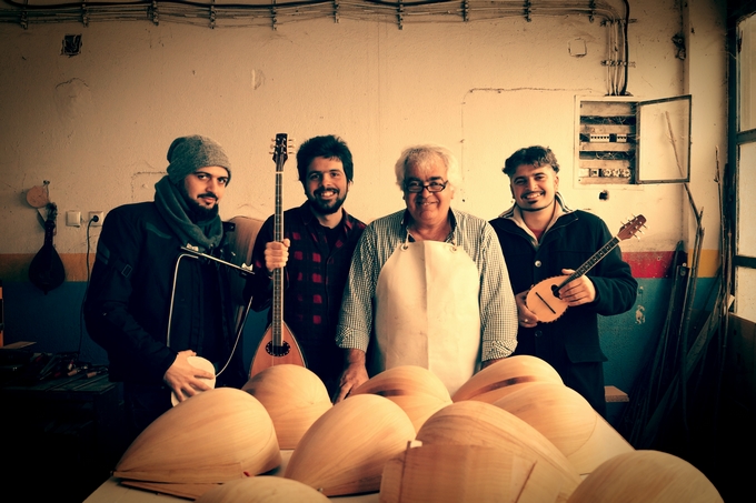 Η οικογένεια Κουμαρτζή που βρίσκεται πίσω από την αναβίωση των αρχαίων ελληνικών μουσικών οργάνων στον 21ο αιώνα. Από αριστερά: Νίκος (graphic & product designer), Θοδωρής (μουσικός), Αναστάσιος (οργανοποιός) και Ιορδάνης (μουσικός)