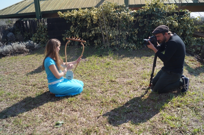 Κατά τα γυρίσματα του videoclip για το Game of Thrones. Ο εικονολήπτης Παναγιώτης Τσανδάρης ( www.backdrop.gr) δεξιά και η Μαρία Σαρηγιαννίδου με τη “Βάρβιτο της Σαπφούς” στα αριστερά.