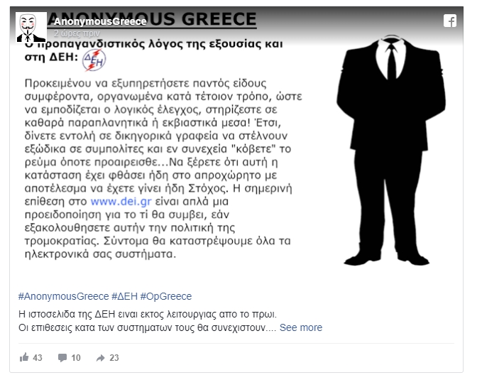 Όπως ενημέρωσαν μέσω της σελίδας τους στο Facebook, η επίθεση στην ιστοσελίδα της ΔΕΗ (dei.gr) είναι “μία προειδοποίηση για το τι θα συμβεί αν εξακολουθήσετε αυτήν την πολιτική της τρομοκρατίας”.