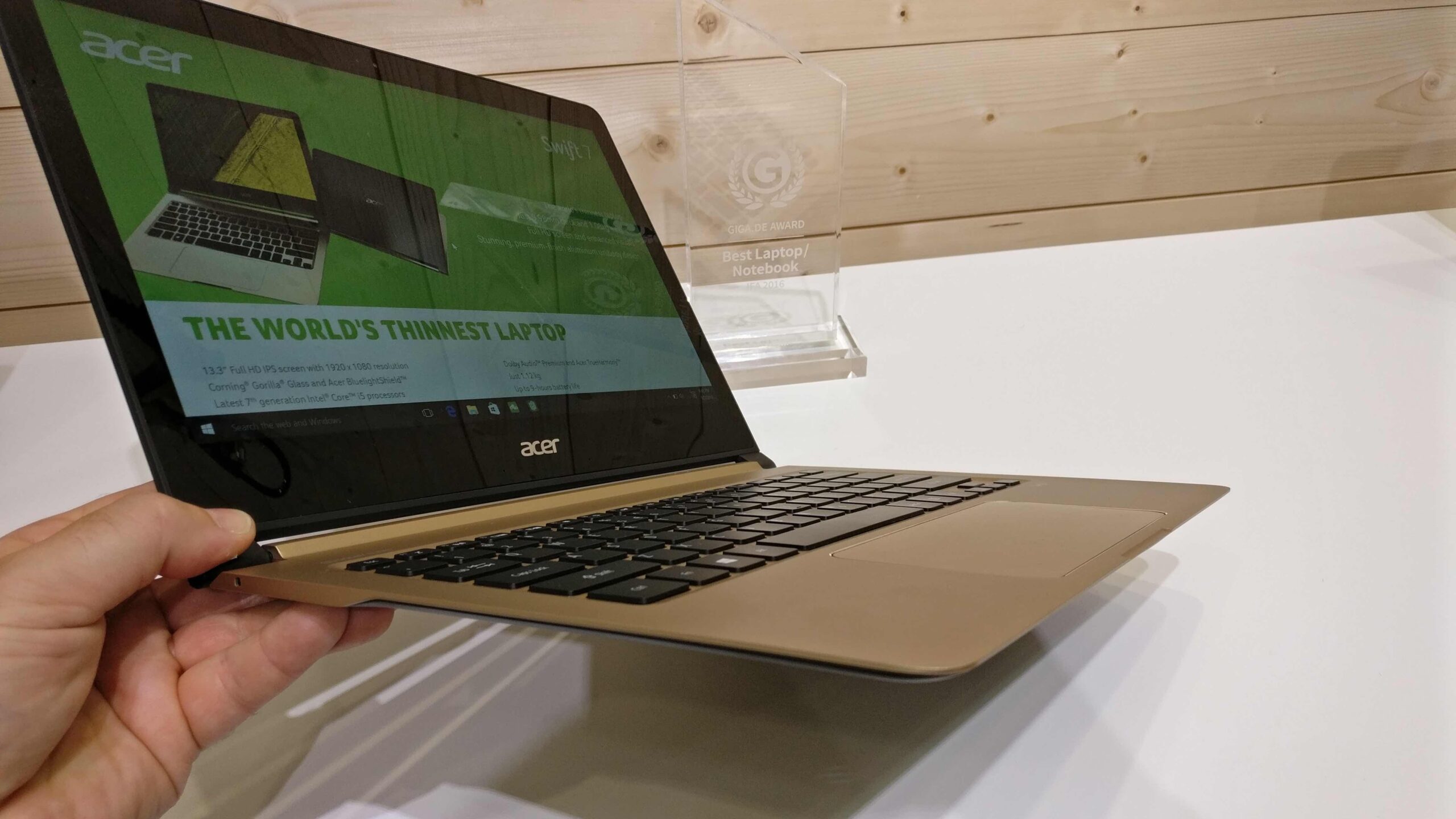 3. Acer Swift 7: Παρουσιάζεται ως το πιο λεπτό laptop στον κόσμο και πραγματικά εντυπωσιάζει με πάχος μόλις 9,8 χιλιοστά! Παράλληλα είναι εξαιρετικά ελαφρύ (λίγο πάνω από ένα κιλό) και αρκετά ισχυρό, ενσωματώνοντας τον νεότερης γενιάς i5 επεξεργαστή της Intel, υποστηριζόμενο από μνήμη 8 Gb και SSD αποθηκευτικό χώρο 256 Gb. Η 13,3 ιντσών Full HD οθόνη του προστατεύεται από Gorilla Glass. Διαθέτει δύο θύρες USB-C (3.1) και σύμφωνα με την Acer η αυτονομία του φτάνει τις 9 ώρες.