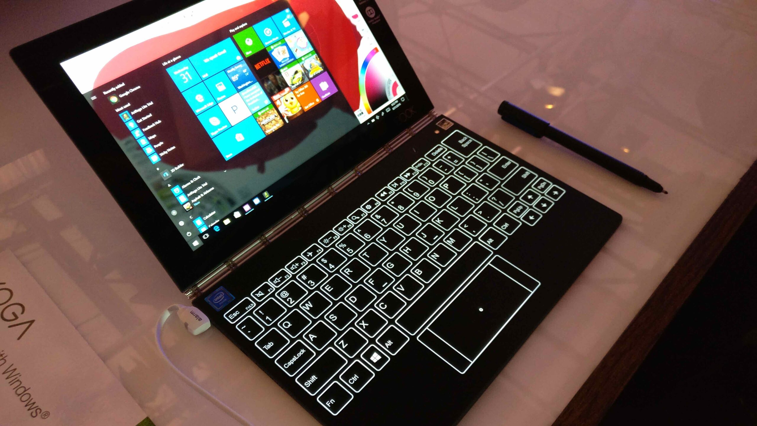 8. Lenovo Yoga Book: Ουσιαστικά αποτελείται από δύο πάνελ, με το ένα να παίζει τον ρόλο του πληκτρολογίου. Δηλαδή, ένα full touch screen πληκτρολόγιο πολλαπλών λειτουργιών, που συνδυάζει software και hardware σε μία διαδραστική επιφάνεια αφής. Η Lenovo το παρουσίασε ως το «το λεπτότερο και ελαφρύτερο 2-σε-1 tablet στον κόσμο». Όμως, ακόμα πιο εντυπωσιακή είναι η λειτουργία του real-pen, που σου επιτρέπει να γράψεις ή να ζωγραφίσεις σε ένα οποιοδήποτε κομμάτι χαρτί τοποθετημένο στην επιφάνεια του πληκτρολογίου, με το περιεχόμενο των χειρόγραφων σημειώσεων να ψηφιοποιείται και να προβάλλεται την ίδια στιγμή στην οθόνη. Το Yoga Book είναι διαθέσιμο με Android ή Windows.