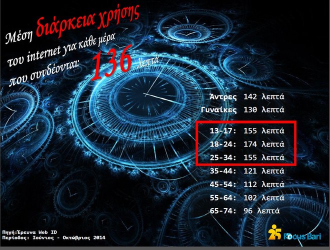 Οι άντρες φαίνεται πως απασχολούνται περισσότερο μπροστά από ένα πληκτρολόγιο, αφού αφιερώνουν σχεδόν 2 1/2 ώρες στο διαδίκτυο (142′ λεπτά), ενώ οι γυναίκες κάθονται ελαφρώς λιγότερο με 130′ λεπτά. Έχει ιδιαίτερο ενδιαφέρον πως, ο χρόνος που αφιερώνουν οι Έλληνες στο ίντερνετ είναι μεγαλύτερος σε πιο μικρές ηλικίες με πρωταθλητές άνδρες και γυναίκες 18 με 24 ετών.
