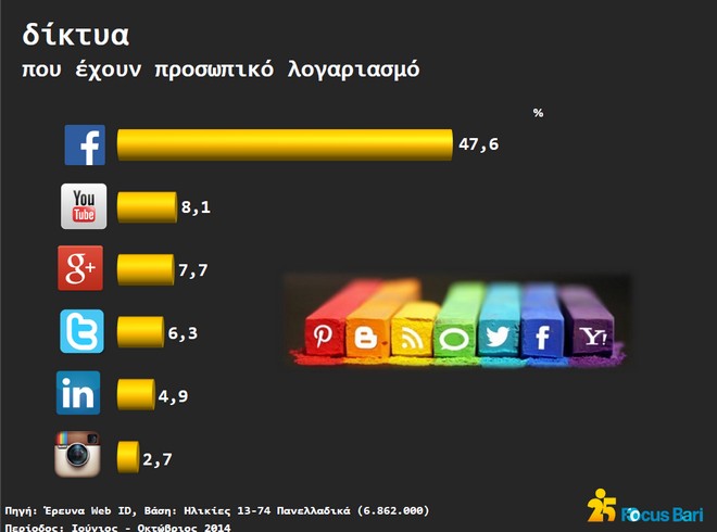 H έρευνα αφορούσε το σύνολο του πληθυσμού ηλικίας 13-74 ετών για τους μήνες Ιούνιο ως Οκτώβριο. Και αν αναρωτιέστε που ξοδεύουμε τον περισσότερο χρόνο μας, όση ώρα βρισκόμαστε Online, η απάντηση ακούει στο όνομα Facebook! Ενδεικτικό είναι πως ένας στους δύο Έλληνες ή το 53.4% διαθέτουν λογαριασμό στα social media, με το 55,4% αυτών να ανήκουν στο ηλικιακό φάσμα 13-34 έτη. Κι όταν λέμε social media, εννοούμε Facebook, αφού τα στοιχεία δείχνουν πως στο σύνολο του πληθυσμού το 47,6% διαθέτει προσωπικό λογαριασμό εκεί, με τα υπόλοιπα social media να βρίσκονται πολύ πίσω.