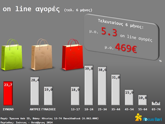 Πέρα από την κοινωνική μας δικτύωση, φαίνεται πως στην Ελλάδα έχουμε εξοικειωθεί πια για τα καλά και με την ιδέα των online αγορών, αφού 1 στους 4 άνδρες και 1 στις 5 γυναίκες επιλέγουν να κάνουν αγορές από τον υπολογιστή τους. Φυσικά και εδώ τη μερίδα του λέοντος καταλαμβάνουν οι πιο νεαρές ηλικίες 18-24 και 25-34 που δήλωσαν πως έκαναν αγορές μέσω διαδικτύου σε ποσοστό 39,8% και 38,6% αντίστοιχα.