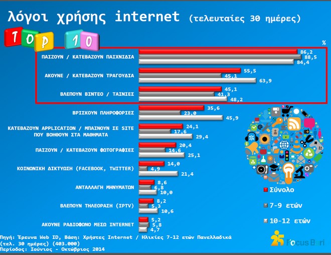 Τέλος, ενδιαφέρον παρουσιάζει η σχέση που έχουν τα μικρά παιδιά με το ίντερνετ και την τεχνολογία. Όπως φαίνεται 8 στα 10 αγόρια και 7 στα 10 κορίτσια ηλικίας 7-9 ετών και 9 στα 10 παιδιά από 10 έως 12 ετών είναι ήδη συστηματικοί χρήστες του διαδικτύου. Τι ακριβώς όμως κάνουν τα μικρά παιδιά στο Internet; Το μεγαλύτερο ποσοστό χρησιμοποιεί το Internet για παιχνίδι (κατεβάζει/παίζει παιχνίδια 86,2%), με τα τραγούδια και τα βιντεάκια και τις ταινίες να ακολουθούν. Μετά την… ψυχαγωγία, ακολουθεί και η εκμάθηση, αφού στην τέταρτη θέση του Top 10 χρήσης του ίντερνετ από τα ελληνόπουλα βρίσκεται η χρήση του για να βρουν πληροφορίες και ακολουθεί η είσοδος σε site που βοηθούν στα μαθήματα.
