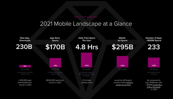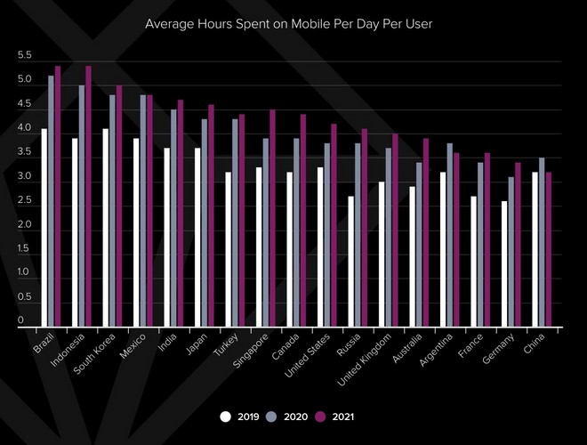 Στις 10 κορυφαίες αγορές που αναλύθηκαν, ο μέσος χρόνος που αφιερώθηκε σε εφαρμογές ξεπέρασε τις 4 ώρες και τα 48 λεπτά το 2021 και αυξήθηκε κατά 30% από το 2019. Πρόκειται για χώρες όπως η Βραζιλία, η Ινδονησία, η Νότια Κορέα, το Μεξικό, η Ινδία, η Ιαπωνία , η Τουρκία , η Σιγκαπούρη, ο Καναδάς, οι ΗΠΑ, η Ρωσία, το Ηνωμένο Βασίλειο, η Αυστραλία, η Αργεντινή, η Γαλλία, η Γερμανία και η Κίνα.