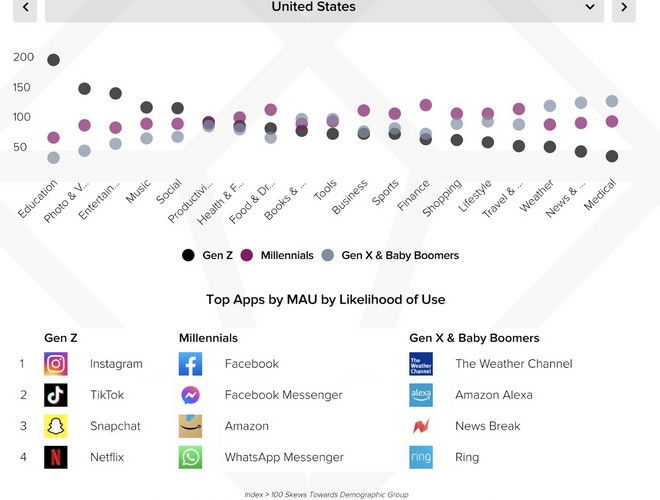 Μεγάλο μέρος του χρόνο των χρηστών αφιερώθηκε σε εφαρμογές των μέσων κοινωνικής δικτύωσης. Στις ΗΠΑ, οι πιο χρησιμοποιούμενες εφαρμογές της Gen Z περιλαμβάνουν το Instagram, το TikTok, το Snapchat και το Netflix. Οι Millennials από την άλλη προτίμησαν το Facebook, το Messenger, το Amazon και το WhatsApp.