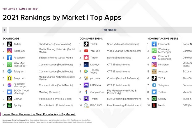 Στην έκθεση της App Annie συμπεριλήφθηκαν επίσης οι κορυφαίες εφαρμογές και τα παιχνίδια παγκοσμίως. Οι πρώτες πέντε εφαρμογές με τις περισσότερες λήψεις για το 2021 ήταν το Google Meet, το Instagram, το TikTok, το Microsoft Teams και το InShot.