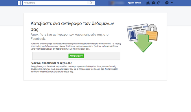 Κάνοντας κλικ στο πράσινο κουμπί “Λήψη αρχείου”, θα αρχίσει να κατεβαίνει ένας zipαρισμένος φάκελος, ο οποίος θα περιέχει όλα σας τα δεδομένα που είναι διαθέσιμα στο Facebook. Βλέποντας τον όγκο αυτών, εσείς θα αποφασίσετε αν θα διατηρήσετε τον λογαριασμό σας ή όχι.