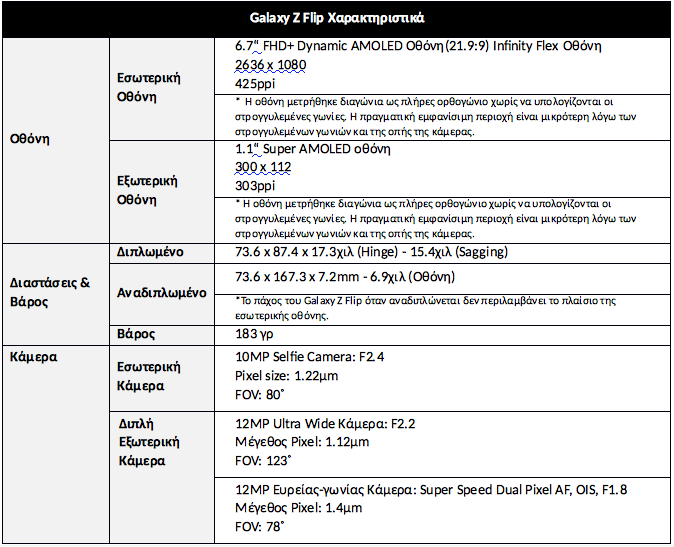 Σχεδιασμένο με ένα καινοτόμο, κρυφό μηχανισμό άρθρωσης και ειδικά προσαρμοσμένο UX, το Galaxy Z Flip παρέχει κομψούς νέους τρόπους δημιουργίας, κοινοποίησης και εμπειρίας περιεχομένου. Από τον γεμάτο στιλ σχεδιασμό του ως την νέα εμπειρία κάμερας, το Galaxy Z Flip ξεκινά τη νέα δεκαετία στην κατηγορία καινοτόμων, αναδιπλούμενων κινητών συσκευών.