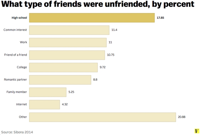 Ο Sibona ρώτησε 1,077 άτομα και έλαβε την εξής απάντηση: Ο μέσος χρήστης είναι πολύ πιθανό να διαγράψει τους παλιούς συμμαθητές του, από το σχολείο ή το Πανεπιστήμιο. Λογικό. Για πολλούς από τους χρονικά πρώτους χρήστες του Facebook, το site δημιουργήθηκε όταν τελείωναν το σχολείο, άρα οι πρώτοι φίλοι τους χρονολογούνται από τότε.
