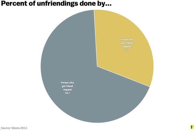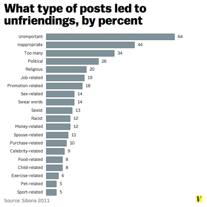 Σε άλλη έρευνα του, ο Sibona ρώτησε 1,137 άτομα σχετικά με το γιατί διαγράφουν φίλους. Οι αιτίες έχουν να κάνουν με online αλλά και offline (πραγματική ζωή) δεδομένα. Οι ερωτώμενοι μπορούσαν να επιλέξουν παραπάνω από μία απαντήσεις. Οι offline αιτίες ήταν λίγο πολύ αναμενόμενες και είχαν να κάνουν με την προσωπική σχέση των ατόμων, οι online όμως, παρουσιάζουν ιδιαίτερο ενδιαφέρον: