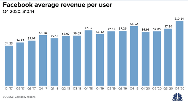 Όπως αναφέρεται από τις targeted ads η εταιρία κέρδισε το 2020 το ποσό των 86 δισεκατομμυρίων δολαρίων. Ποσό κατά 156% μεγαλύτερο από το 2019. Τα 10.14 δολάρια που εισέπραξε από κάθε ενεργό χρήστη, στο τέταρτο τρίμηνο του 2020 ήταν τα περισσότερα που έχει πάρει από το πρώτο τρίμηνο του 2017 μέχρι σήμερα, όπως μπορείς να δεις και στο γράφημα του CNBC.