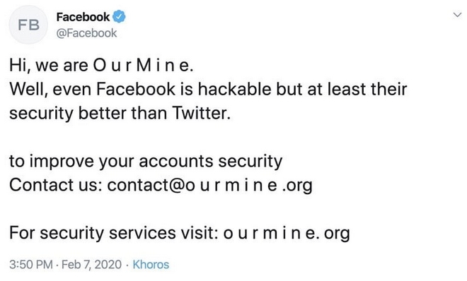 Ο πρόλογος για το χθεσινοβραδινό συμβάν στο Twitter, όπου η φημισμένη ομάδα hackers με όνομα OurMine πήρε στον έλεγχο της τον επίσημο λογαριασμό της Facebook και δημοσίευσε ένα διαφημιστικό tweet για τις υπηρεσίες της, ενώ παράλληλα έριξε και ένα καρφάκι για την ασφάλεια της Twitter. Μόλις πήραν χαμπάρι τι συνέβη, κατέβασαν αμέσως την ανάρτηση των hackers, αλλά μετά από λίγα λεπτά η OurMine την ανέβασε ξανά.