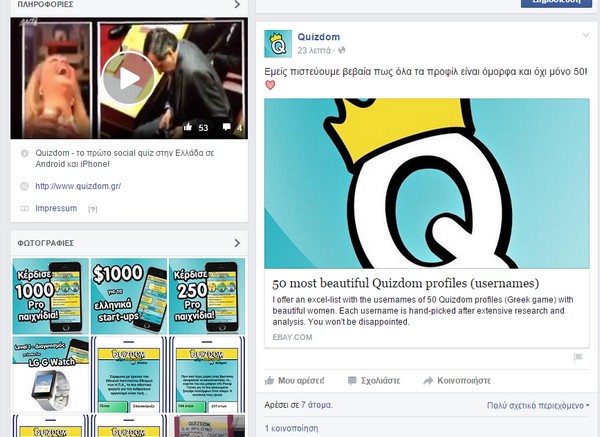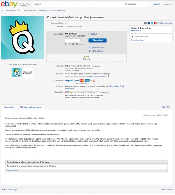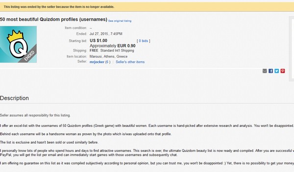 Ένα περίεργο περιστατικό απόπειρας πώλησης φωτογραφιών προφίλ χρηστών στο Quizdom έπεσε χτες στην αντίληψή μας. Ειδικότερα, ένας χρήστης στο ebay, ονόματι mrjocker ισχυριζόταν πως έχει σε λίστα excel 50 προφίλ με τις πιο όμορφες Ελληνίδες, όπως αποδεικνύει η φωτογραφία που έχουν ανεβάσει έκαστη.