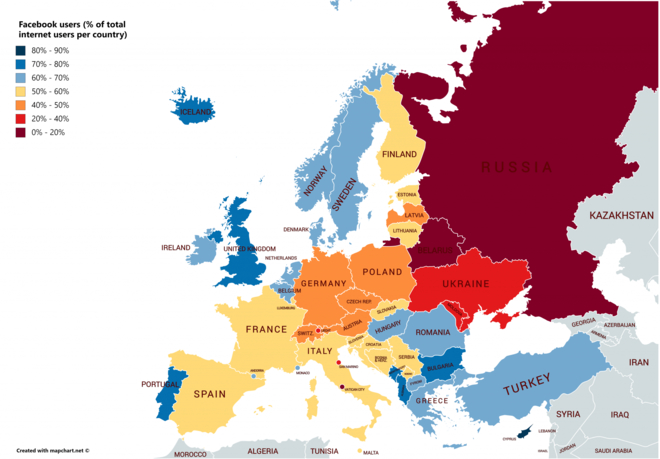 Το ποσοστό των χρηστών ίντερνετ στην Ευρώπη που διαθέτουν και λογαριασμό Facebook. Γιατί η Ρωσία είναι μόλις στο 11%