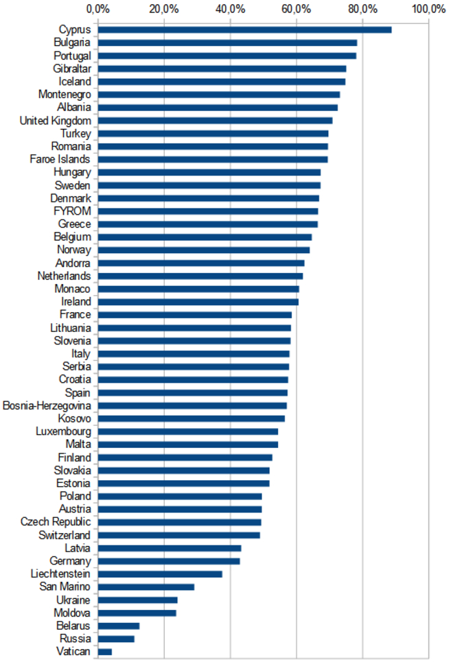 Όπως φαίνεται και από τον χάρτη, αλλά και τον πίνακα πιο κάτω, πρωταθλητές είναι οι Κύπριοι οι οποίοι σε ποσοστό 88,8% διαθέτουν λογαριασμό στο facebook. Σε σχετική απόσταση την πρώτη τριάδα συμπληρώνουν άλλες δύο χώρες της Νότιας Ευρώπης, η Βουλγαρία (78,3%) και η Πορτογαλία (78,1%).