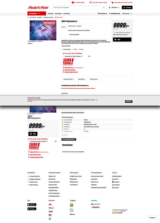 Όπως αναφέρει το Techgear.gr, το σουηδικό τμήμα της γνωστής αλυσίδας έχει αναρτήσει στην επίσημη ιστοσελίδα του την σελίδα για το Sony PlayStation 5, απ’ όπου δέχεται προπαραγγελίες σε τιμή 9999 σουηδικές κορώνες (περίπου €950). Στα τεχνικά χαρακτηριστικά αναφέρει λίγα πράγματα από αυτά που έχουν γίνει γνωστά, όπως επεξεργαστή AMD Zen 2 (7nm), επεξεργαστή γραφικών AMD βασισμένο στην αρχιτεκτονική Radeon Navi με υποστήριξη τεχνολογίας Ray-Tracing, αποθηκευτικό χώρο SSD και τεχνολογία ήχου 3D audio, ενώ τονίζει ότι θα είναι συμβατό με τα παιχνίδια του PS4.