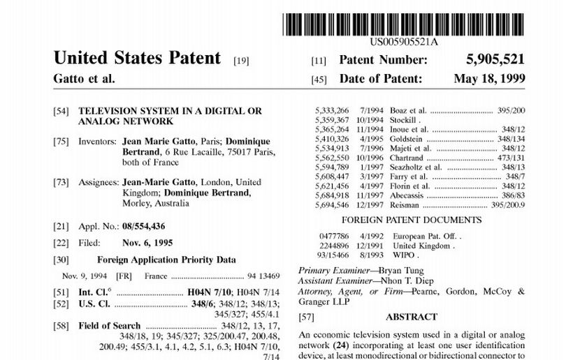 Η αίτηση για το πρώτο δίπλωμα ευρεσιτεχνίας που αφορούσε το θέμα μας, κατατέθηκε στις 6/11 του 1995. Άνηκε σε γαλλική εταιρία (Fast France Advanced Systems) και αφορούσε ευφυές τηλεοπτικό σύστημα, που ήταν συνδεδεμένο με συστήματα επεξεργασίας πληροφοριών από αναλογική και ψηφιακή τηλεόραση. Είχε και τη δυνατότητα να ‘κατεβάζει’ αυτόματα software, ανάλογα με την επιθυμία του χρήστη. Τα ονόματα που υπάρχουν στην πατέντα είναι Jean Marie Gatto και Dominique Bertrand.
