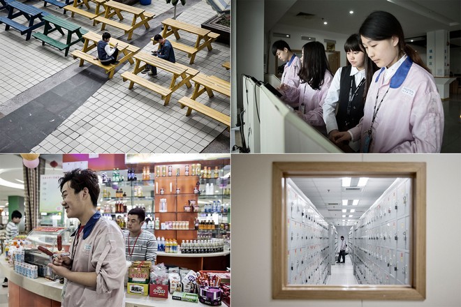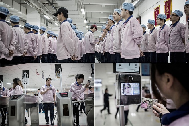 Οι εργαζόμενοι, άνδρες και γυναίκες, κοιτάζουν σε σαρωτές προσώπου και χτυπούν τις κάρτες τους στο μηχάνημα ασφαλείας. Οι αυστηροί έλεγχοι ταυτότητας γίνονται για να μην κάνουν πολλές υπερωρίες. Η όλη διαδικασία διαρκεί λιγότερο από 2 δευτερόλεπτα.