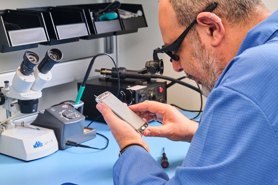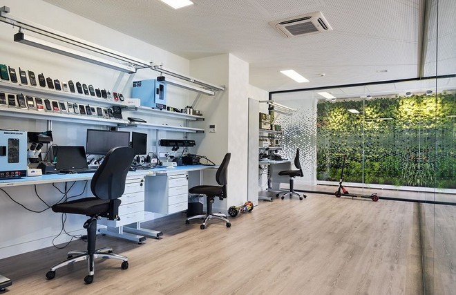 Στη συνέχεια (και αφού φορέσαμε μια ειδική αντιστατική ρόμπα), κατεβήκαμε στο ισόγειο και ξεναγηθήκαμε στην αίθουσα, όπου γίνονται μικρά καθημερινά θαύματα τεχνολογίας. Στην state of the art αίθουσα service οι έμπειροι και πιστοποιημένοι τεχνικοί της εταιρείας επισκευάζουν πάνω από 80.000 συσκευές τον χρόνο, ενώ το 60% των επιδιορθώσεων πραγματοποιούνται εντός της ημέρας. Η διαδικασία επισκευής μοιάζει με χειρουργική επέμβαση. Όλα είναι καθαρά, αποστειρωμένα και γίνονται με μαθηματική ακρίβεια.